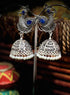 A stunning Silver Replica Jhumka with a big blue Meena-embedded peacock design. The intricate detailing and vibrant colors create an eye-catching and culturally rich piece of Jewellery.
