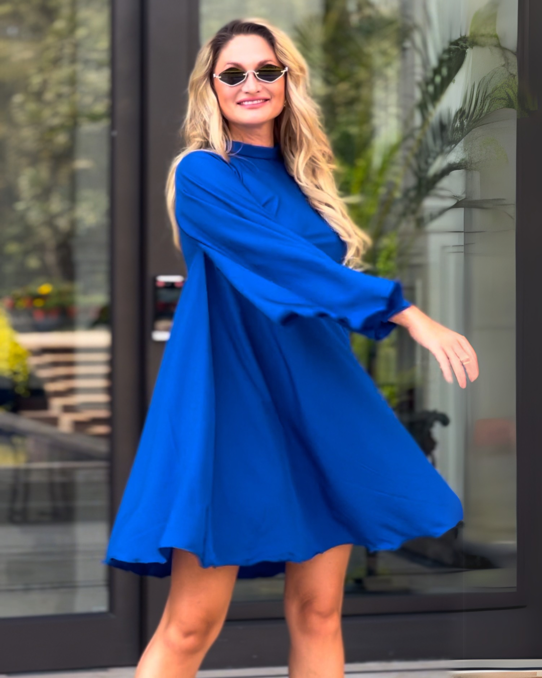 Crafted in a vibrant royal blue hue, this dress boasts a sleek high neckline that adds a touch of refinement, making it suitable for both casual outings and evening events. The loose-fit design ensures maximum comfort and freedom of movement, while the mini length adds a playful and modern edge to your look.