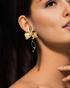 Embrace nature-inspired luxury with these exquisite Golden Orchid Elegance Drop Earrings. Crafted with a delicate floral design, these earrings feature lustrous gold petals, a sparkling crystal center, and elegant flowing stems adorned with pearl accents. The organic, fluid shape adds a touch of sophistication and femininity, making them a perfect statement piece for weddings, evening events, or special occasions. Lightweight and comfortable, these earrings are designed to enhance your elegance with a modern yet timeless charm.