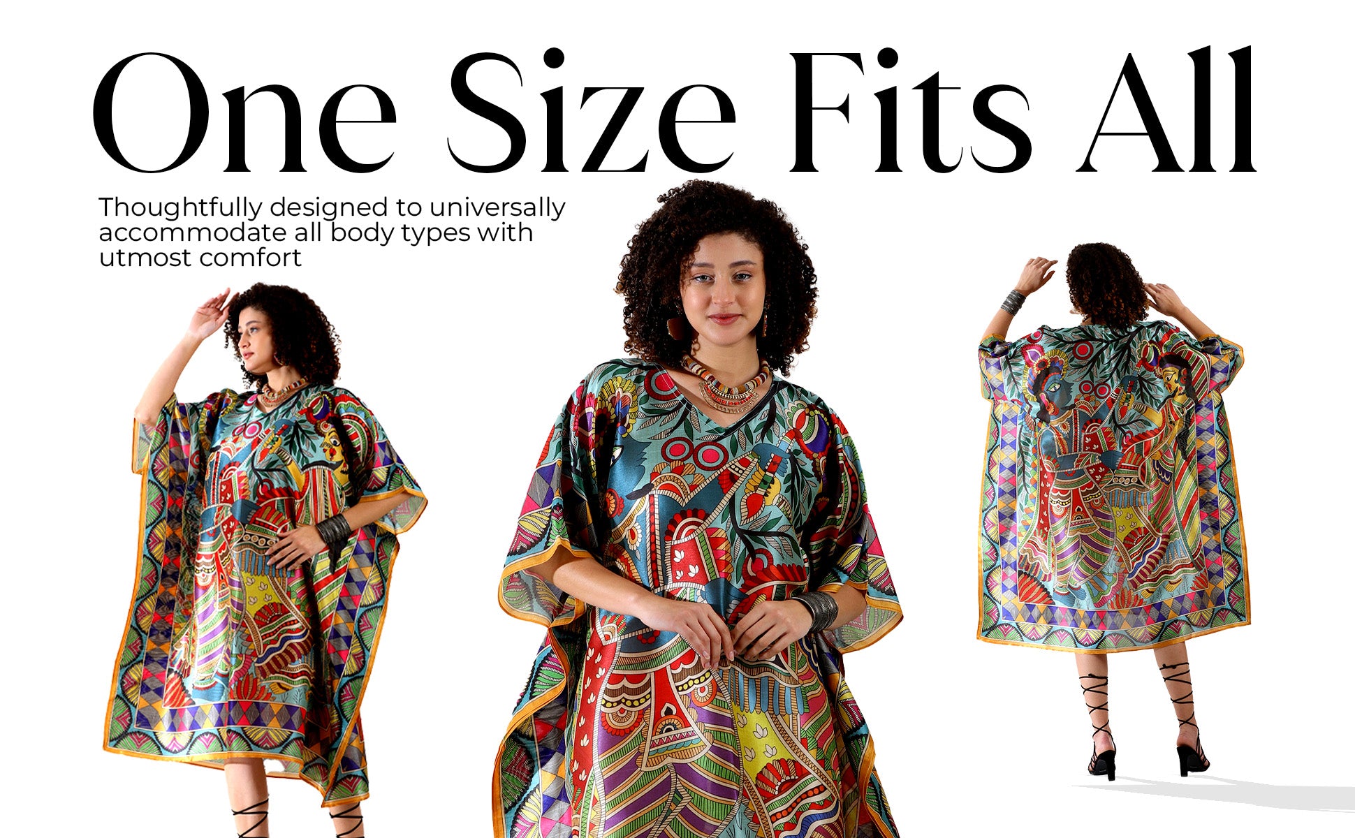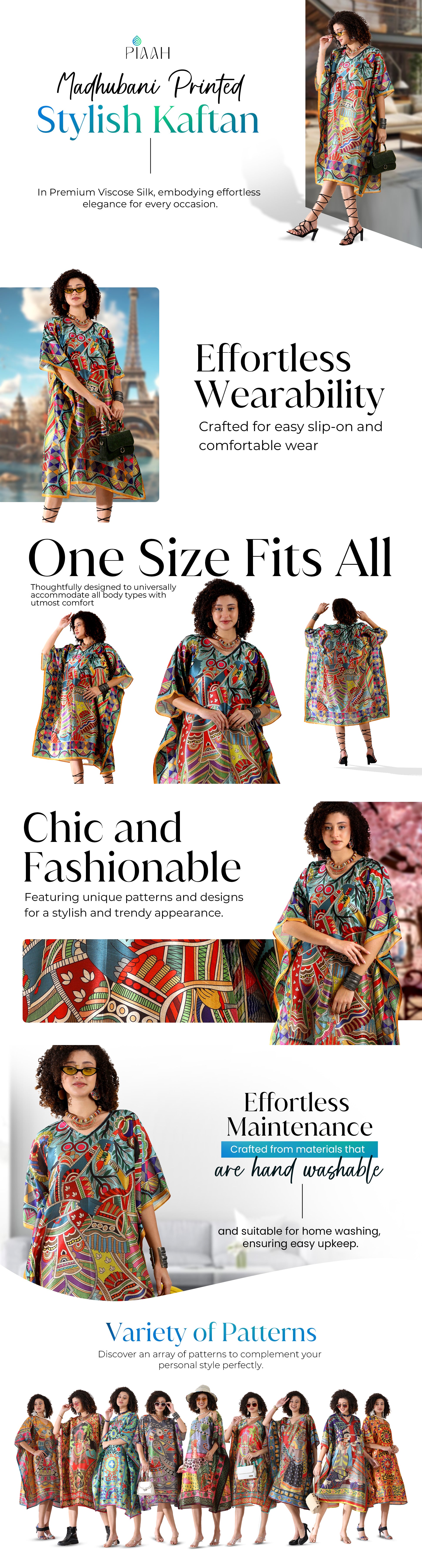 Unique Madhubani Print Piaah's Designer Kaftan showcases a one-of-a-kind Madhubani print, blending traditional artistry with contemporary fashion.Crafted from high-quality viscose silk, this kaftan offers a luxurious feel and smooth texture, ensuring comfort and elegance.