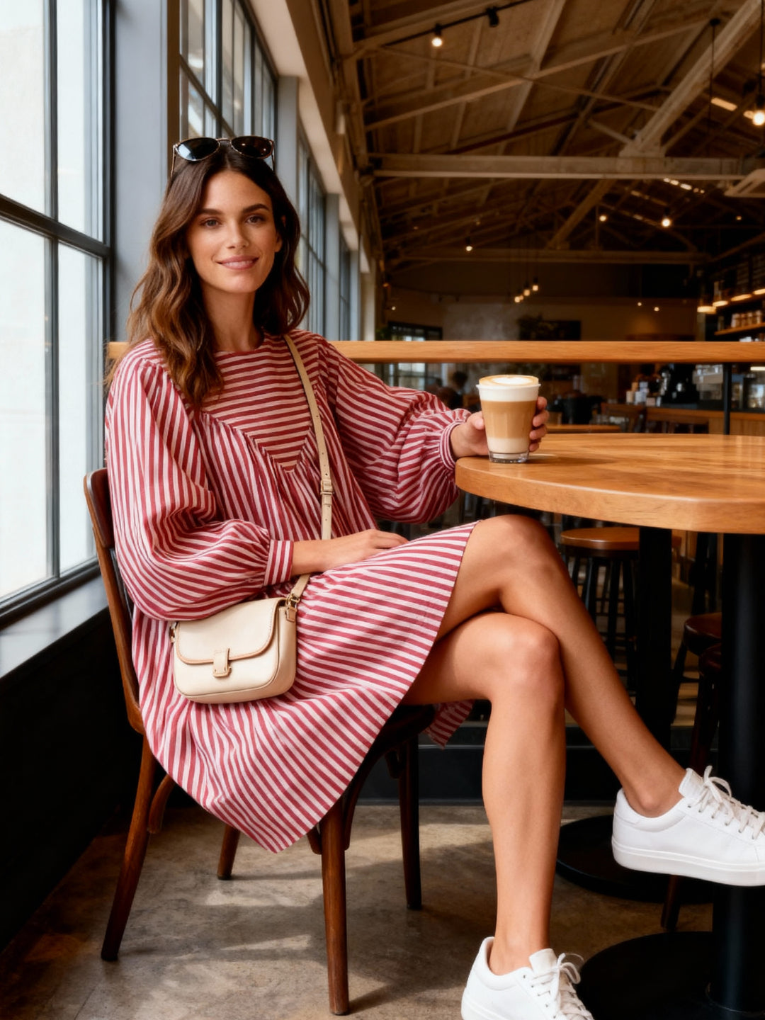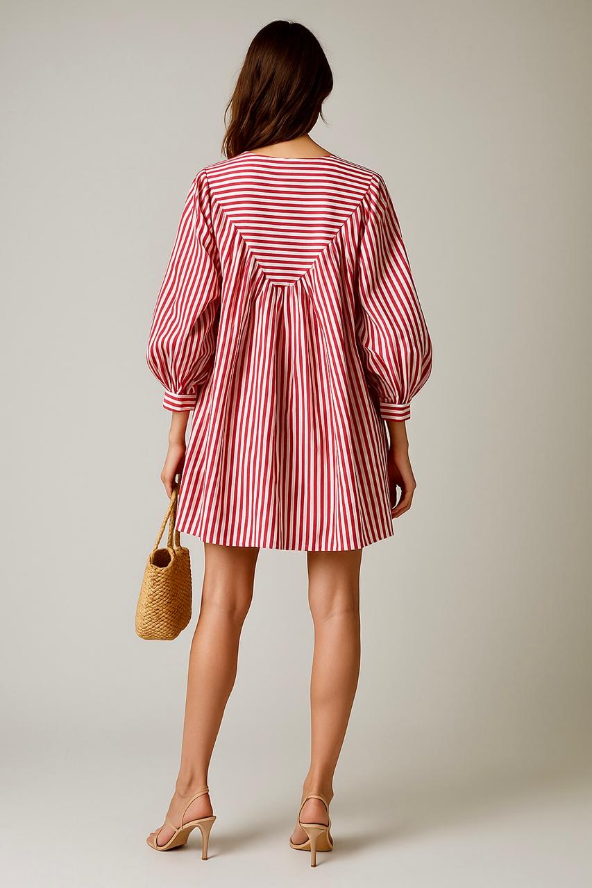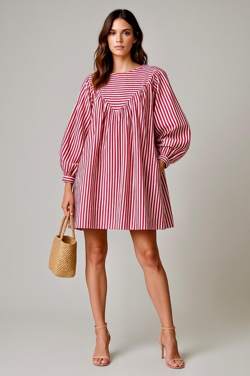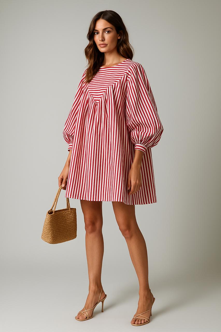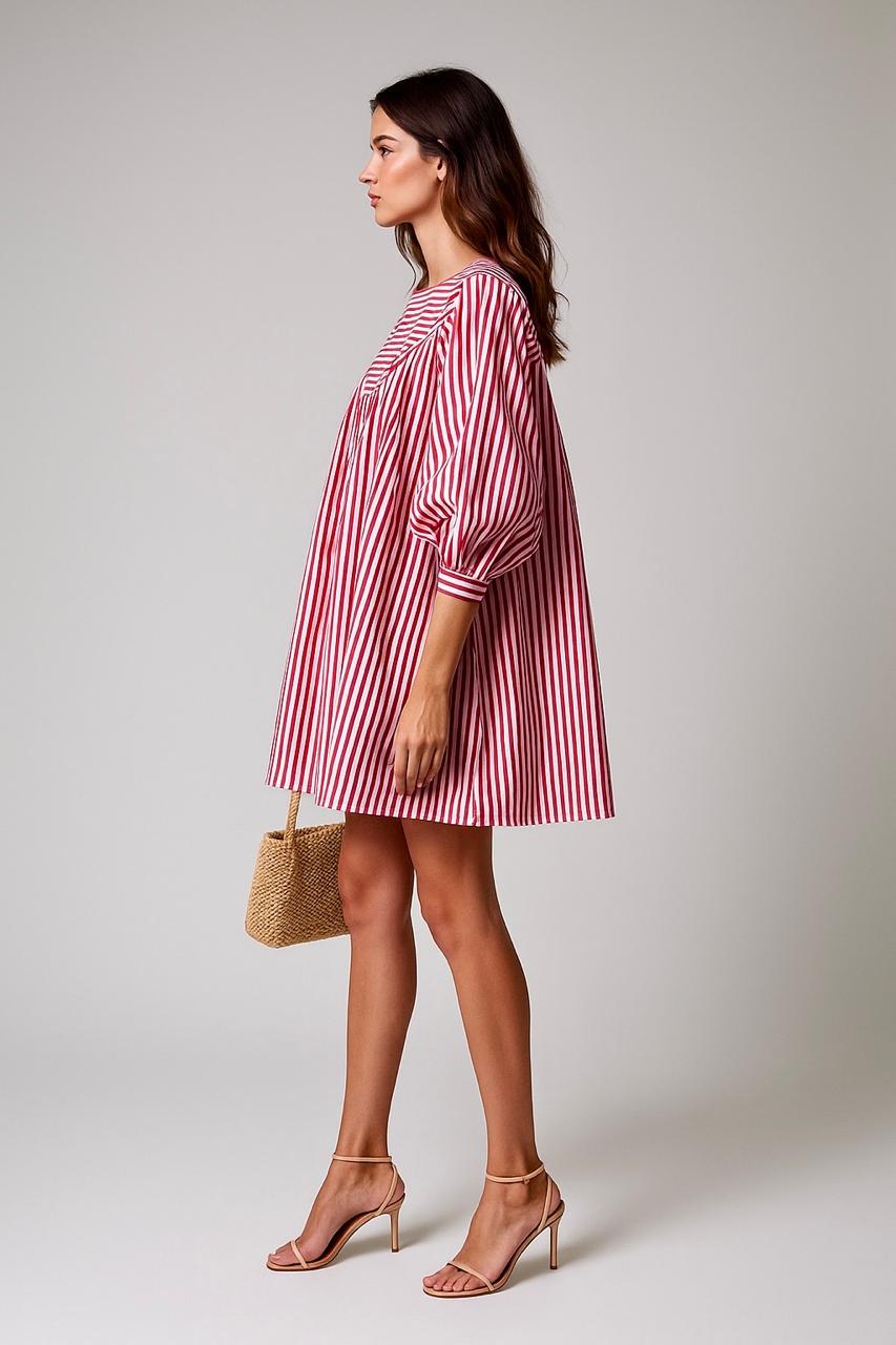 Step into effortless style with our charming Red & White Striped Poplin Smock Dress, a must-have for your summer wardrobe. Crafted from crisp, breathable cotton poplin, this A-line babydoll mini dress offers ultimate comfort and a flattering, relaxed fit perfect for all-day wear. The classic vertical red and white stripes create a chic and elongating effect, while the playful balloon sleeves with elasticated cuffs add a touch of romantic detail. Featuring a comfortable round neckline and a relaxed smock silhouette, this versatile tunic dress transitions seamlessly from casual daytime outings to stylish evening gatherings. Pair it with your favorite sandals or nude heels and a woven bag for a complete, fashion-forward look. Ideal for vacations, brunch, or simply enjoying sunny days in style.