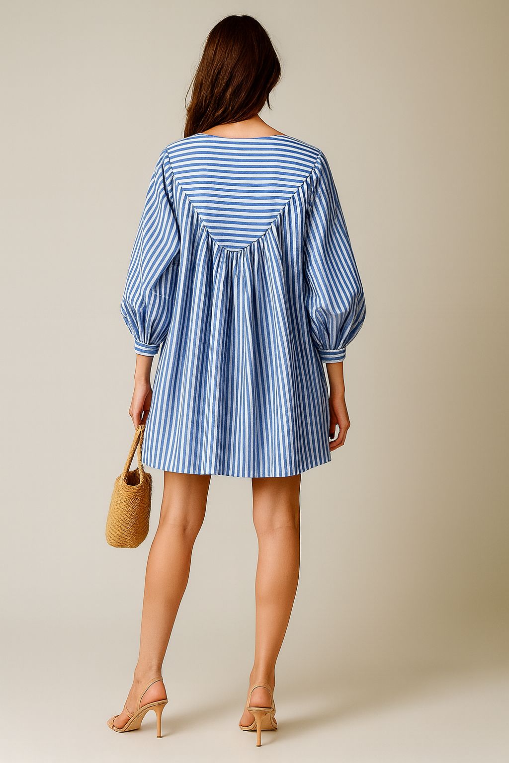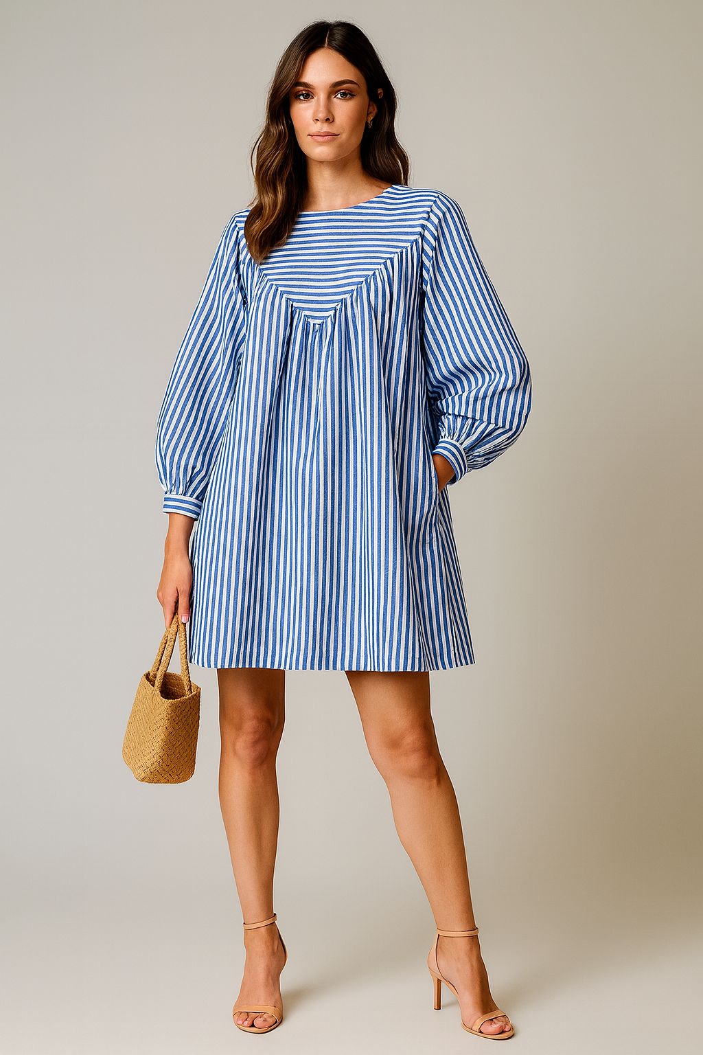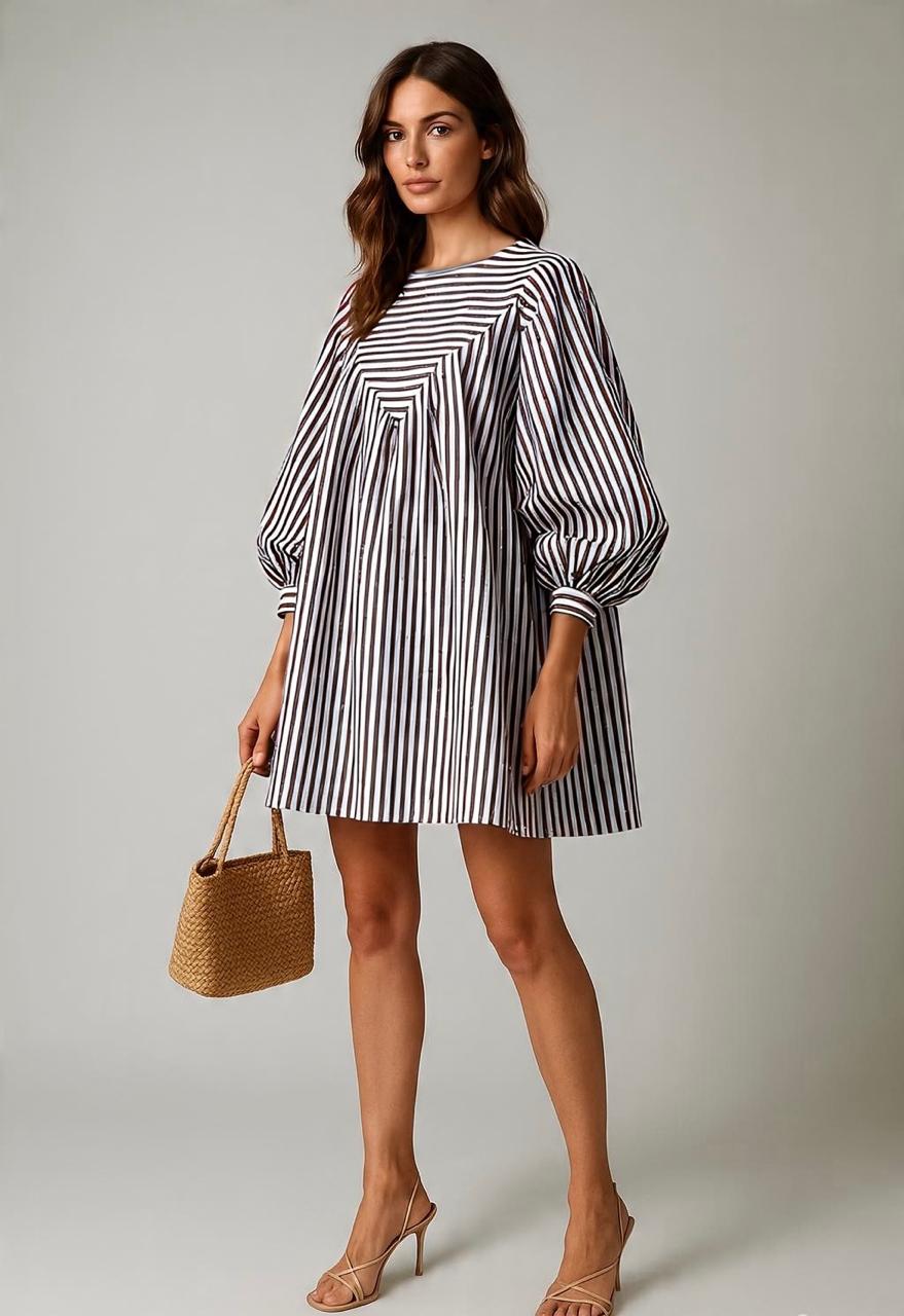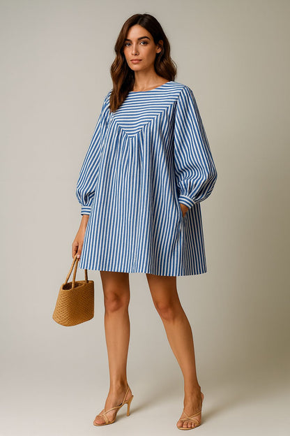 Striped Poplin Smock Dress with Balloon Sleeves | Babydoll Mini Dress | Summer A-Line Tunic