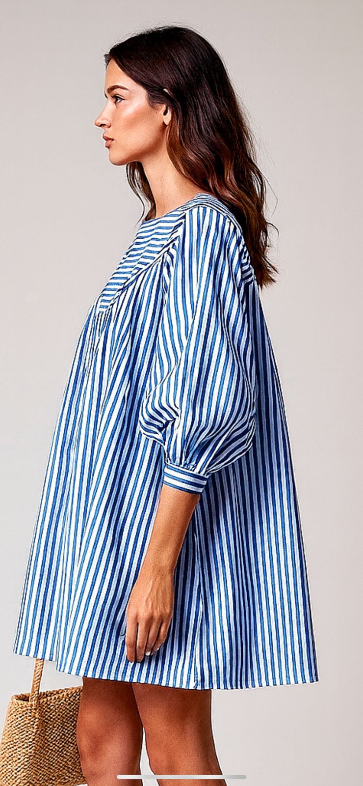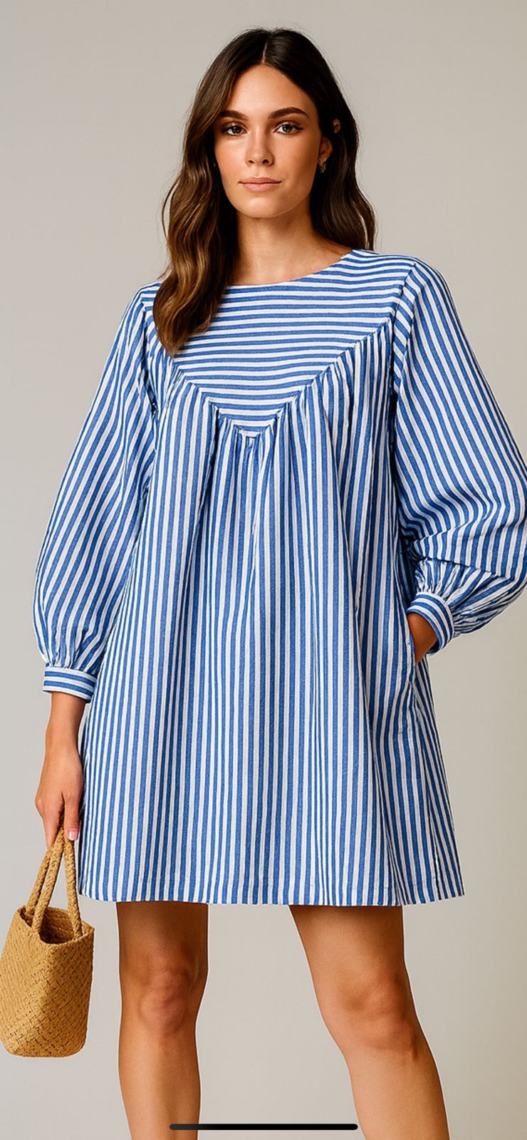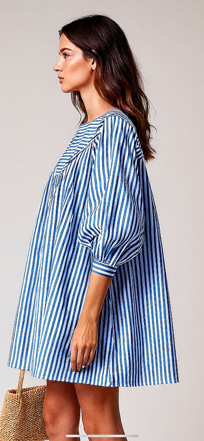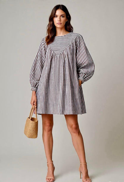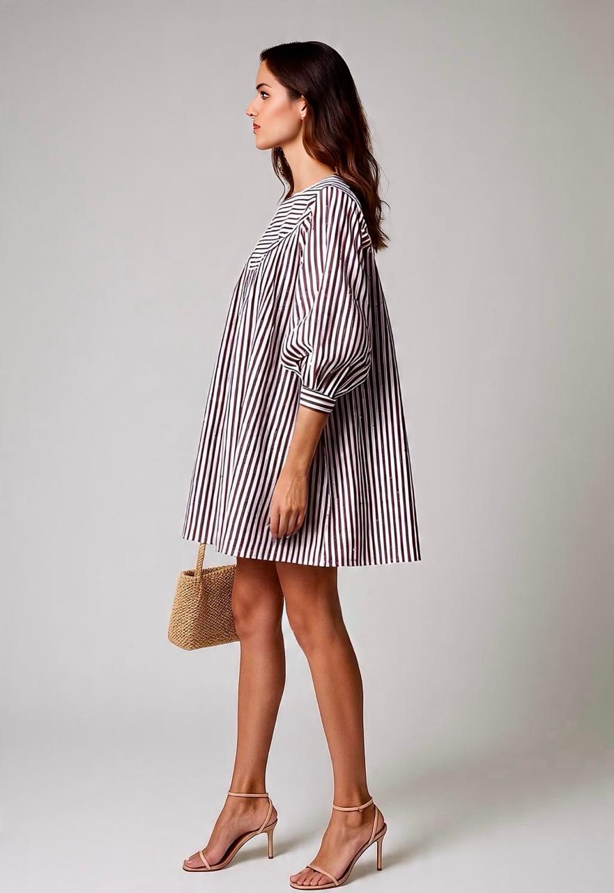 Striped Poplin Smock Dress with Balloon Sleeves | Babydoll Mini Dress | Summer A-Line Tunic