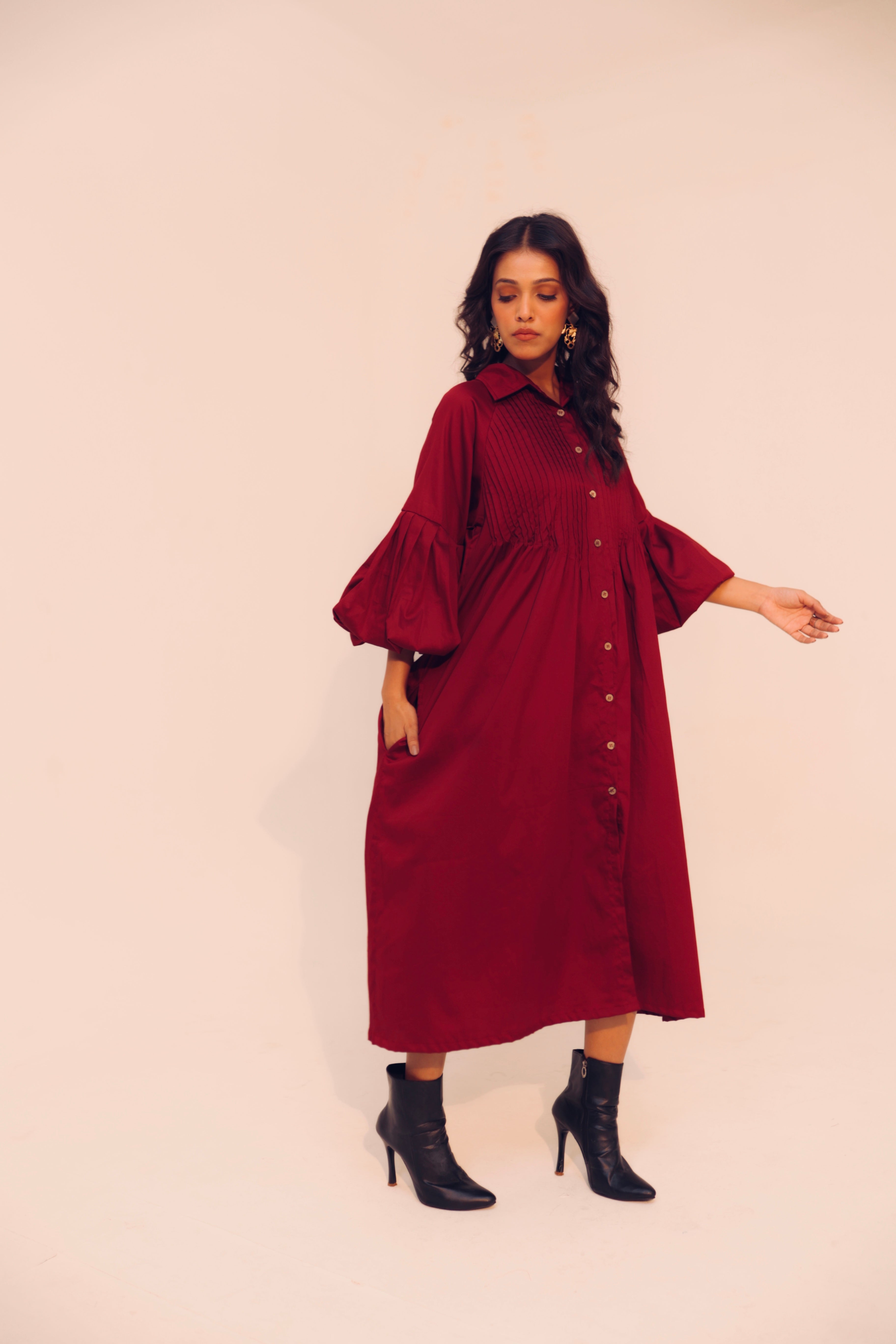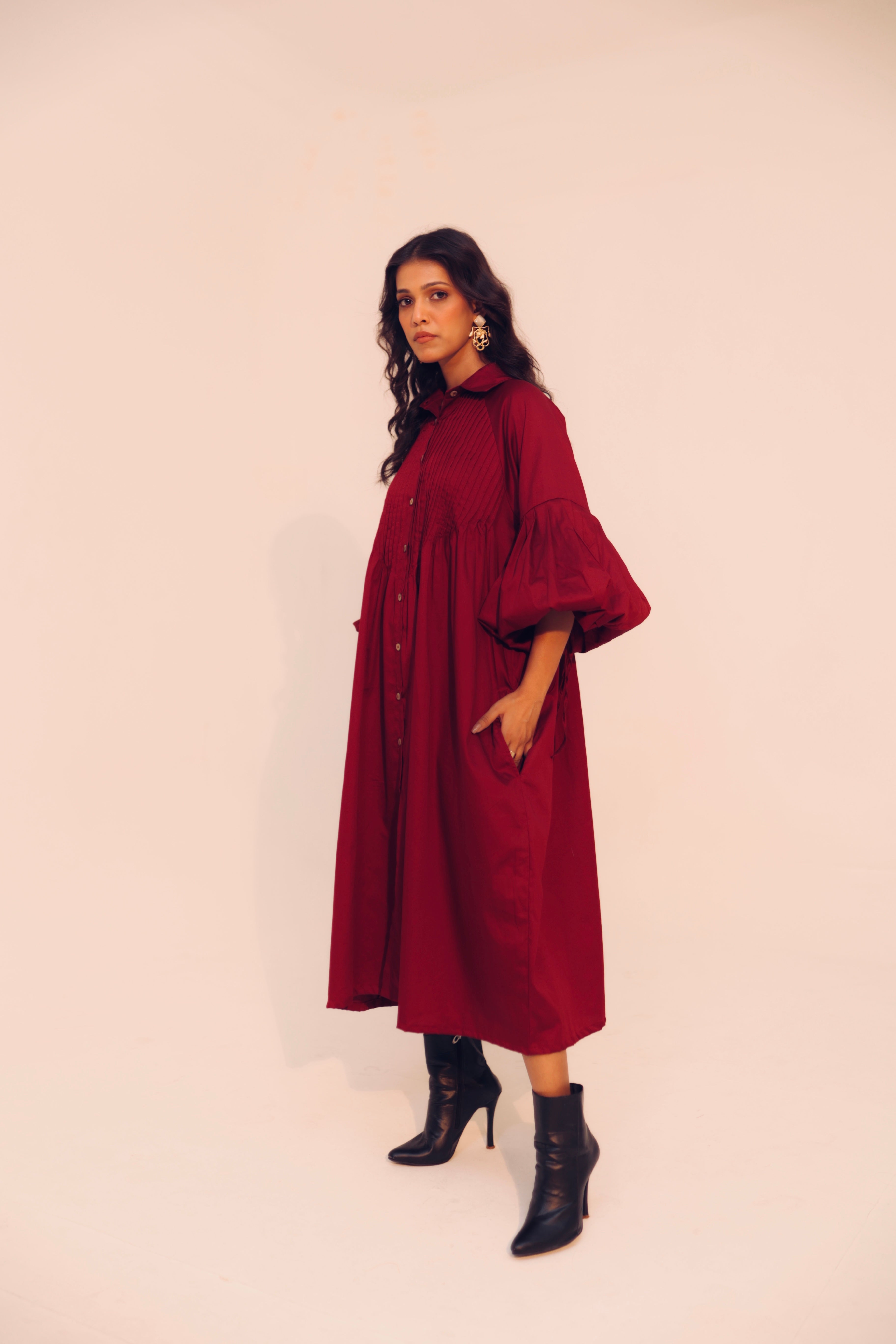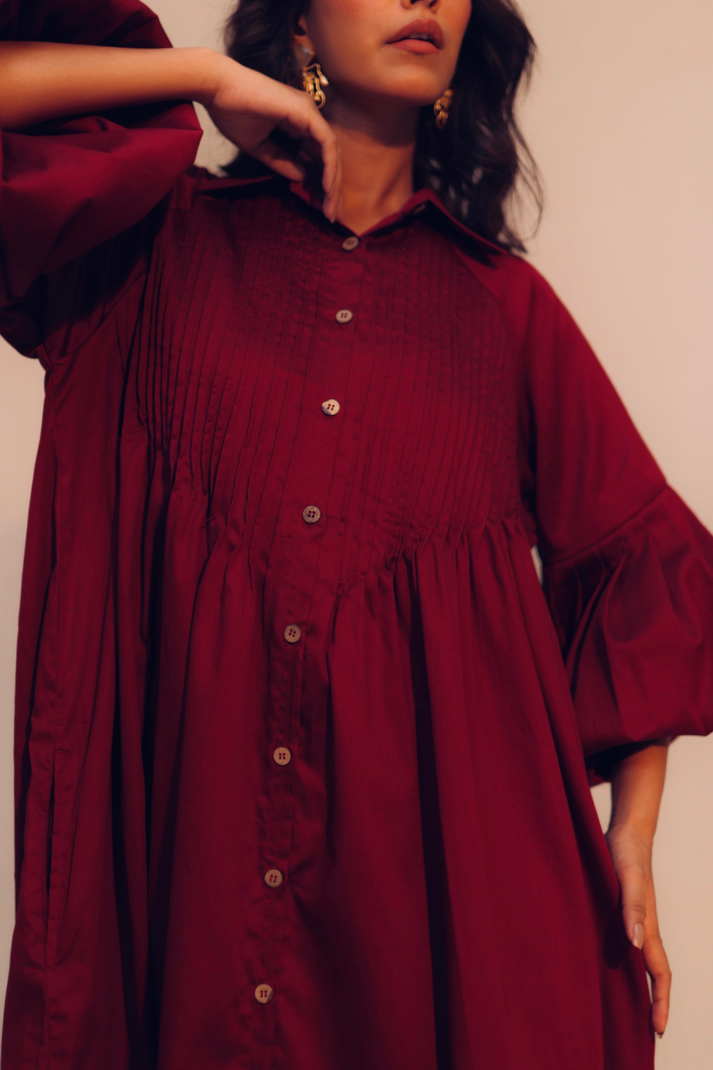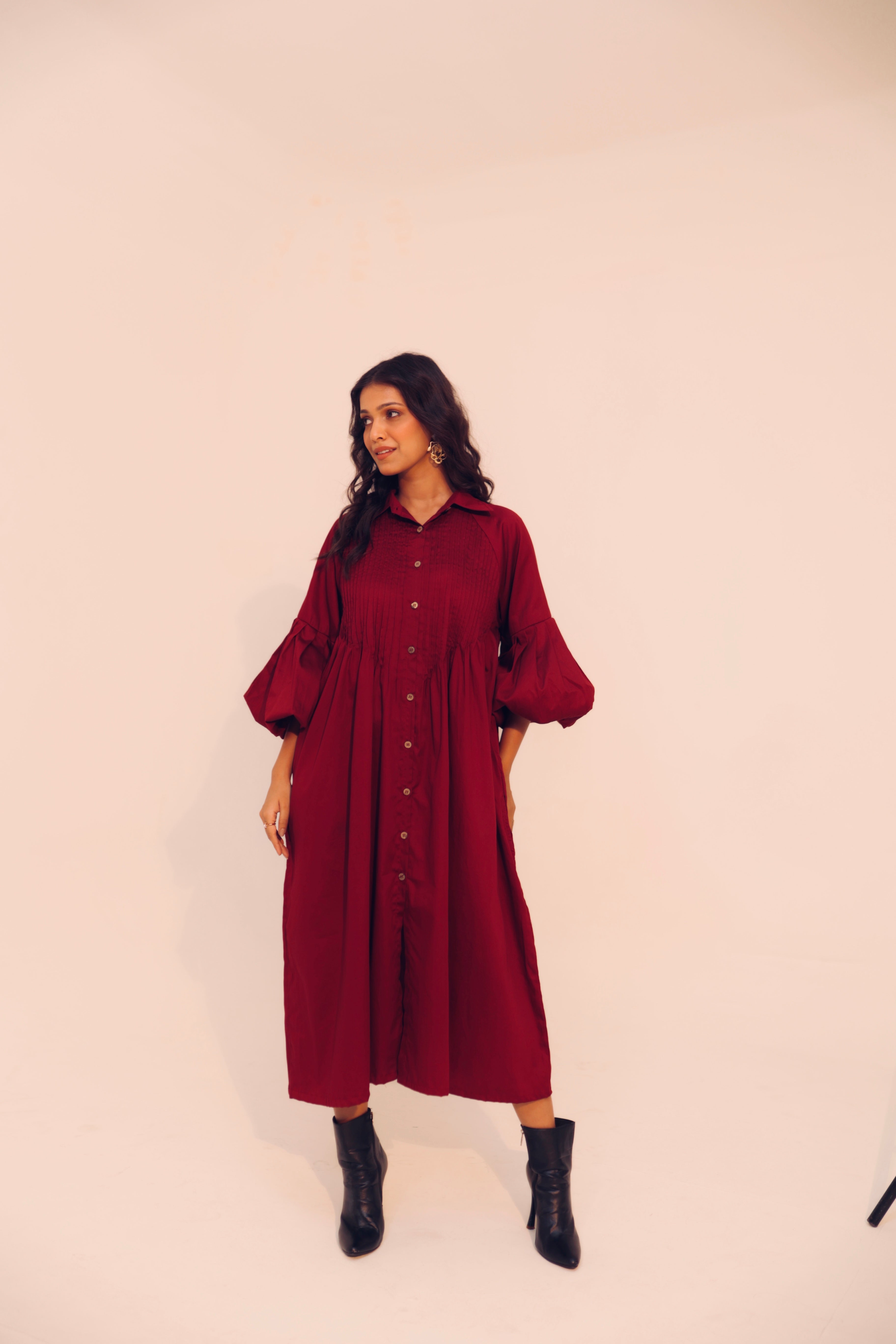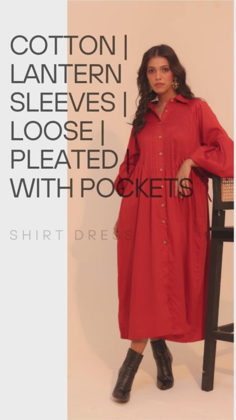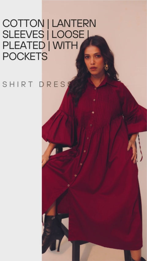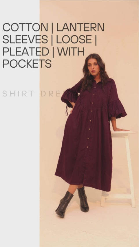 Wine Shirt Dress | Soft Cotton | Loose Pattern | Turn Down Collar | with Pockets
