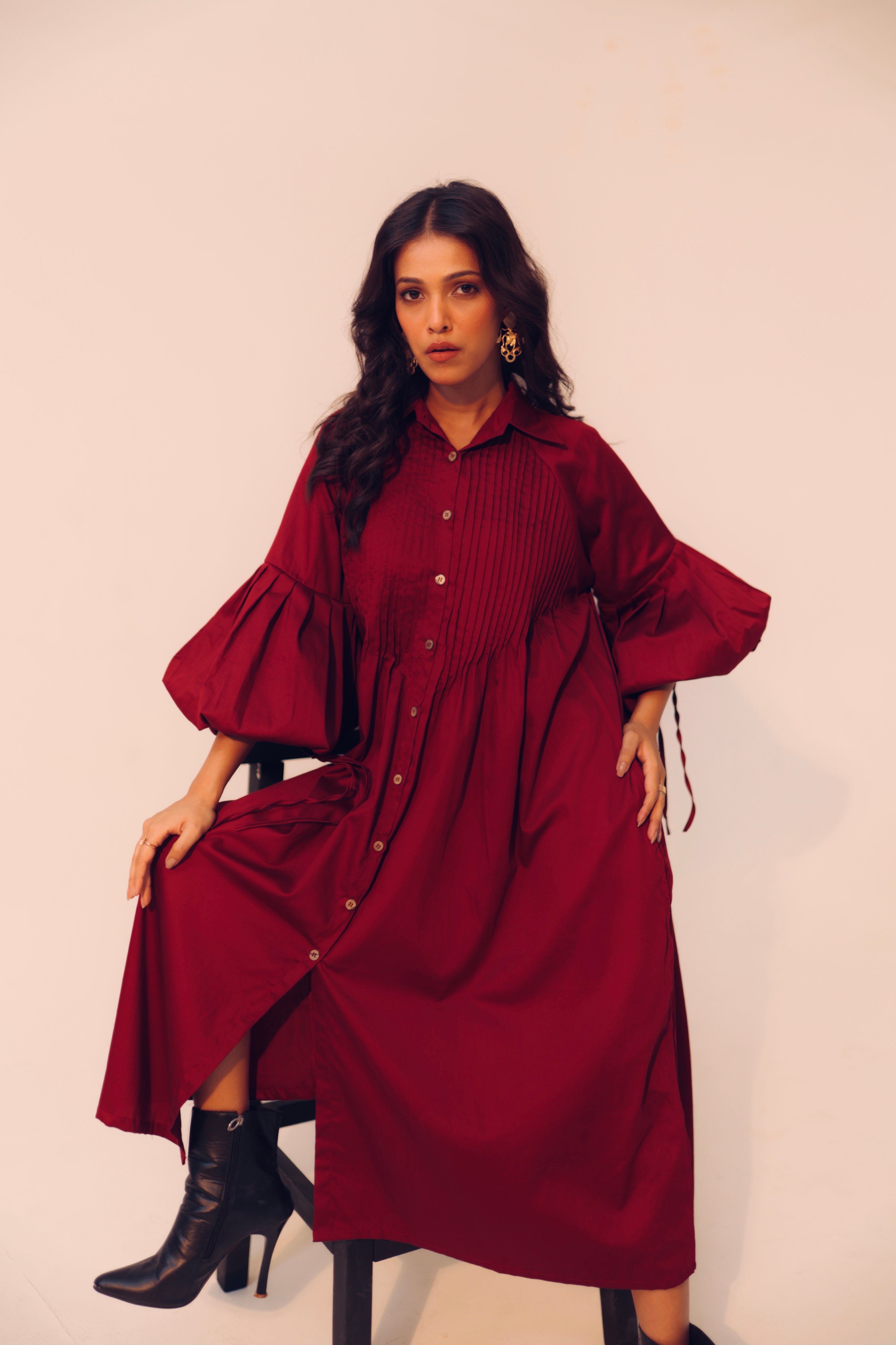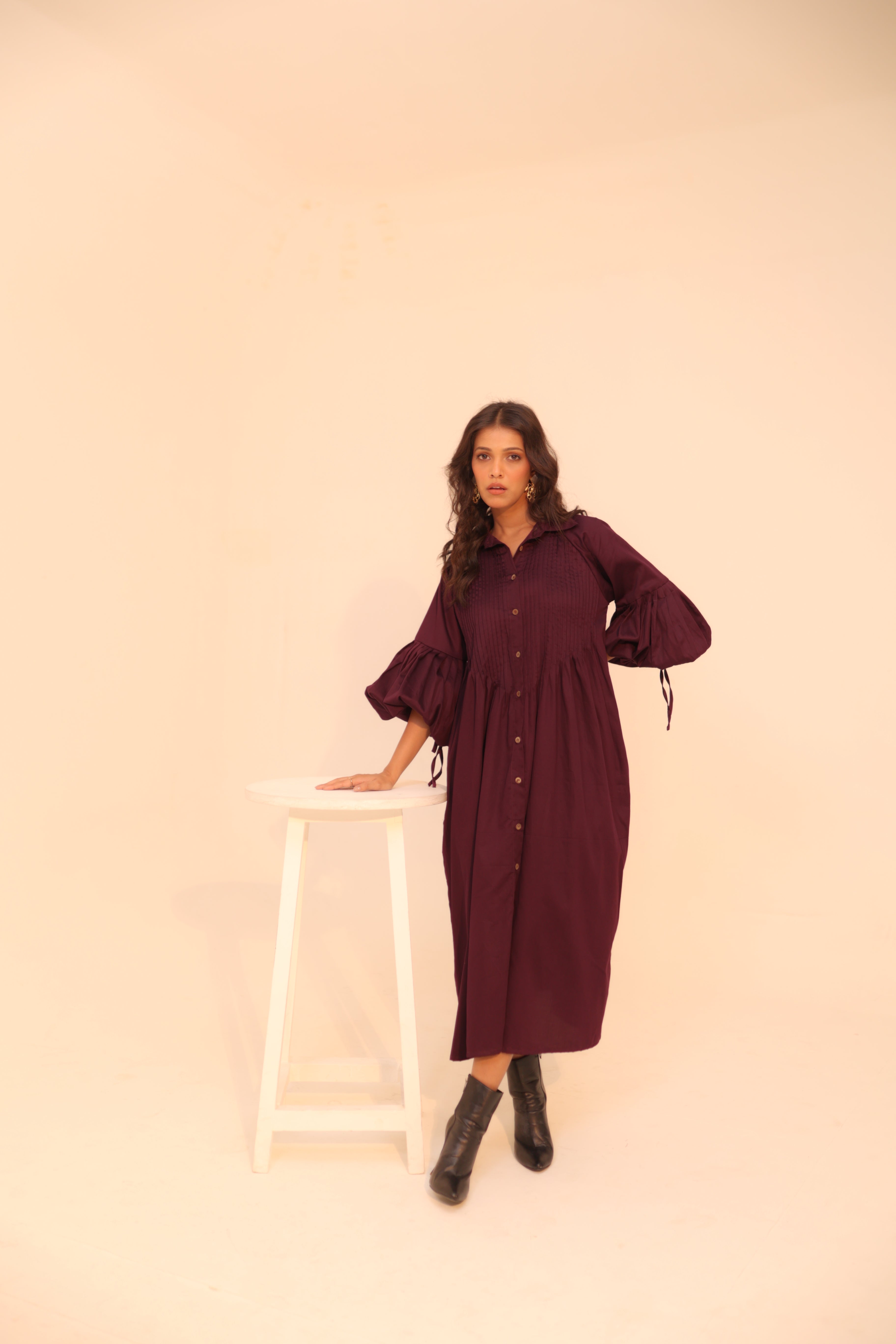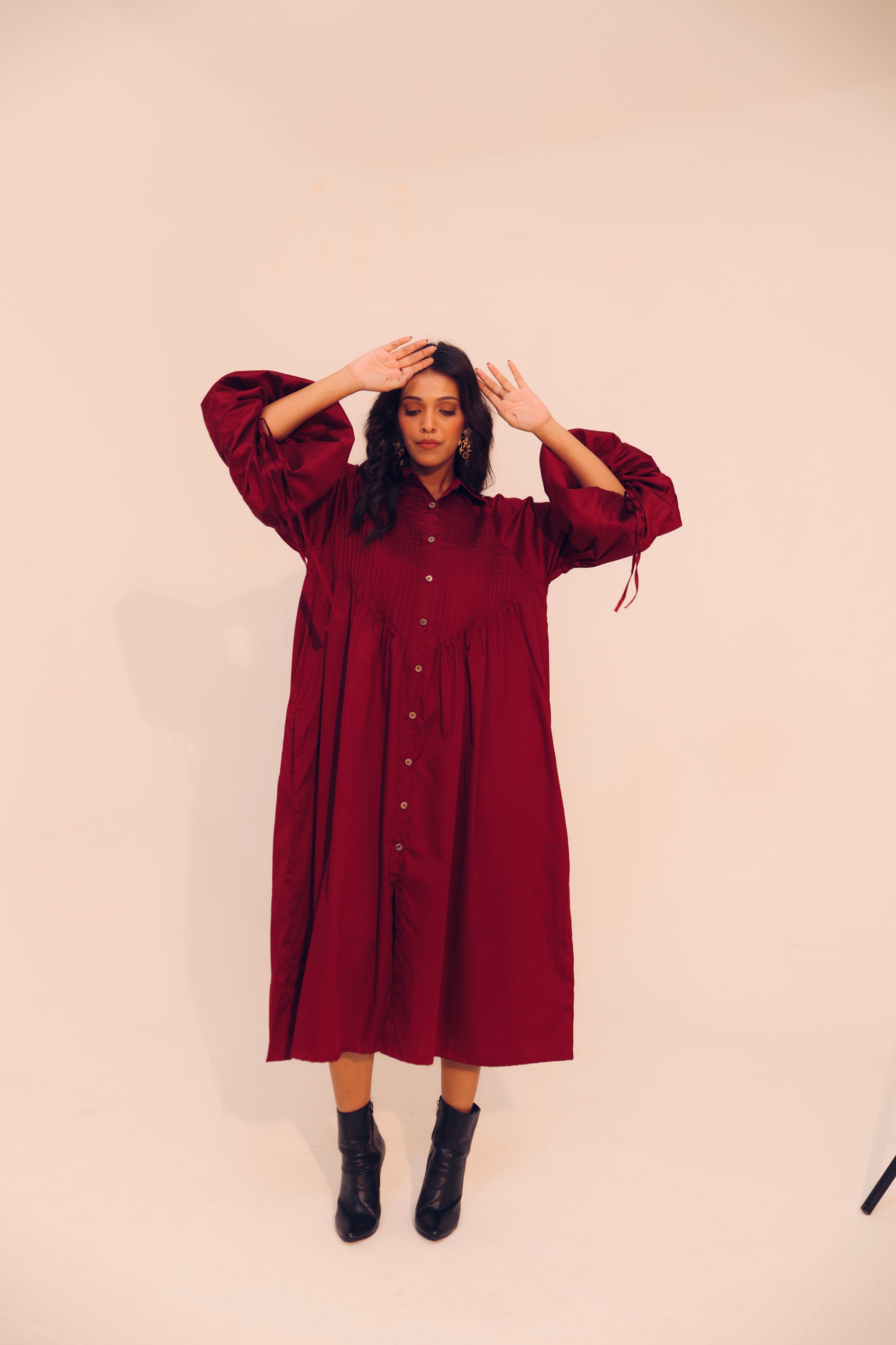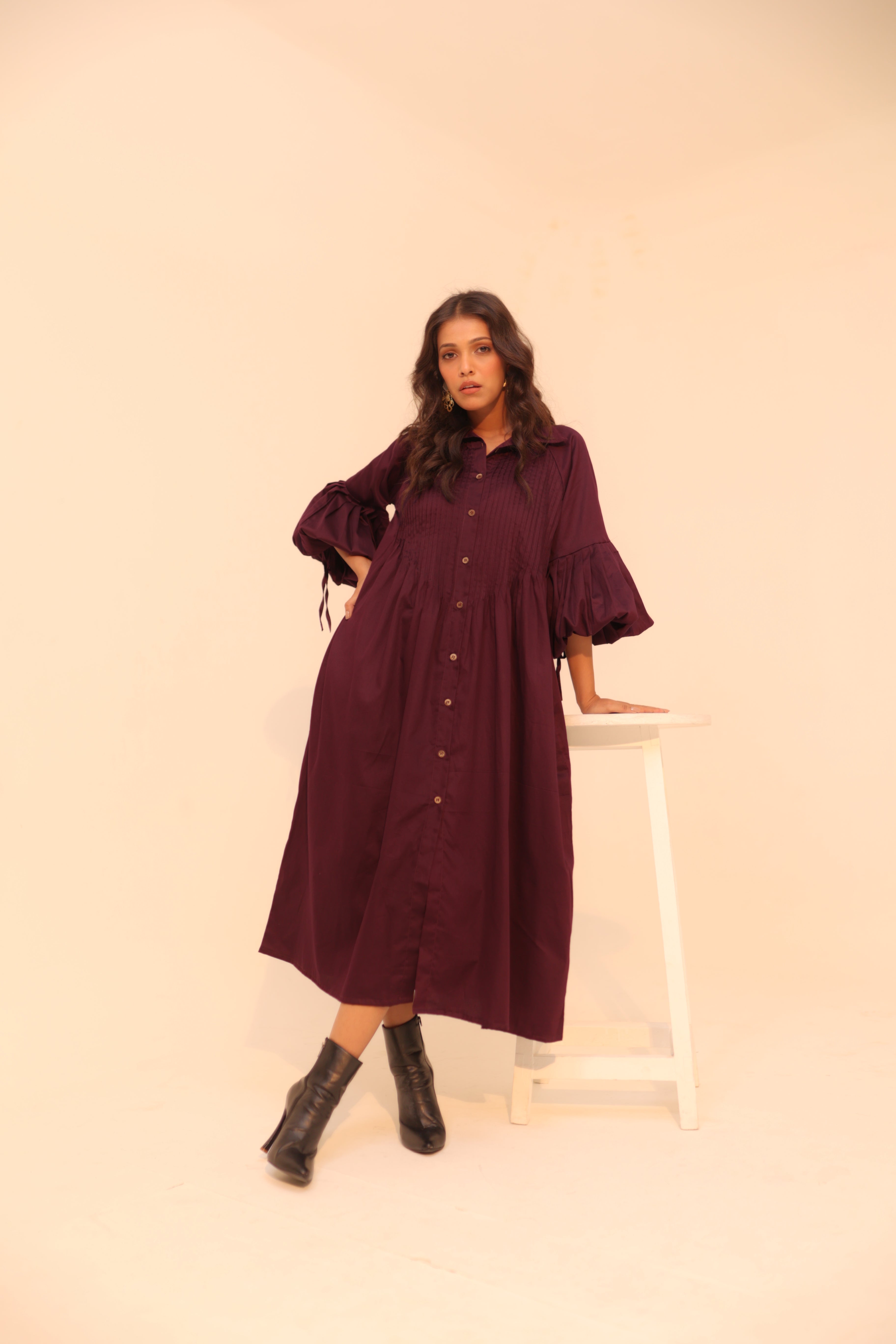 Wine Shirt Dress | Soft Cotton | Loose Pattern | Turn Down Collar | with Pockets