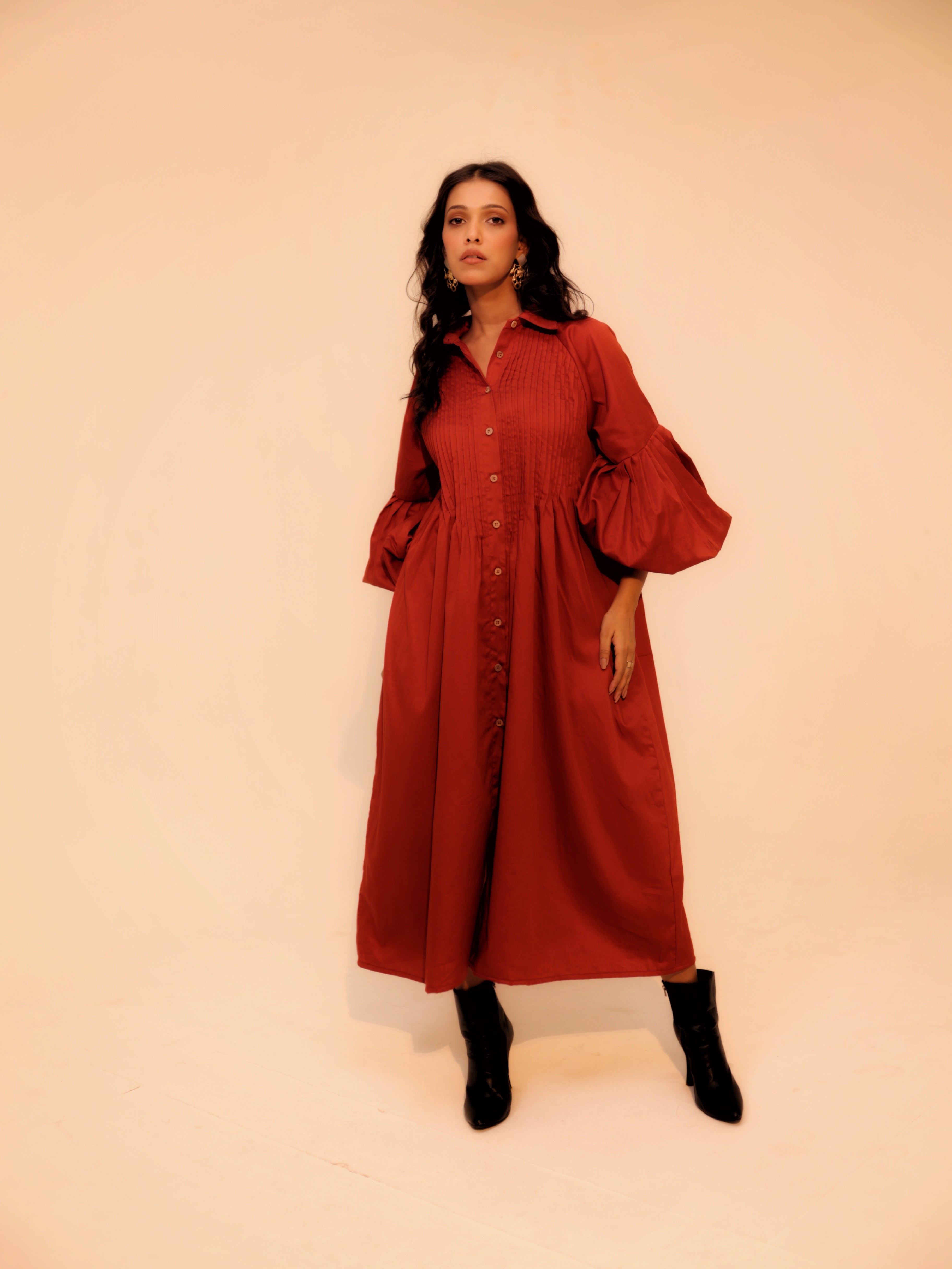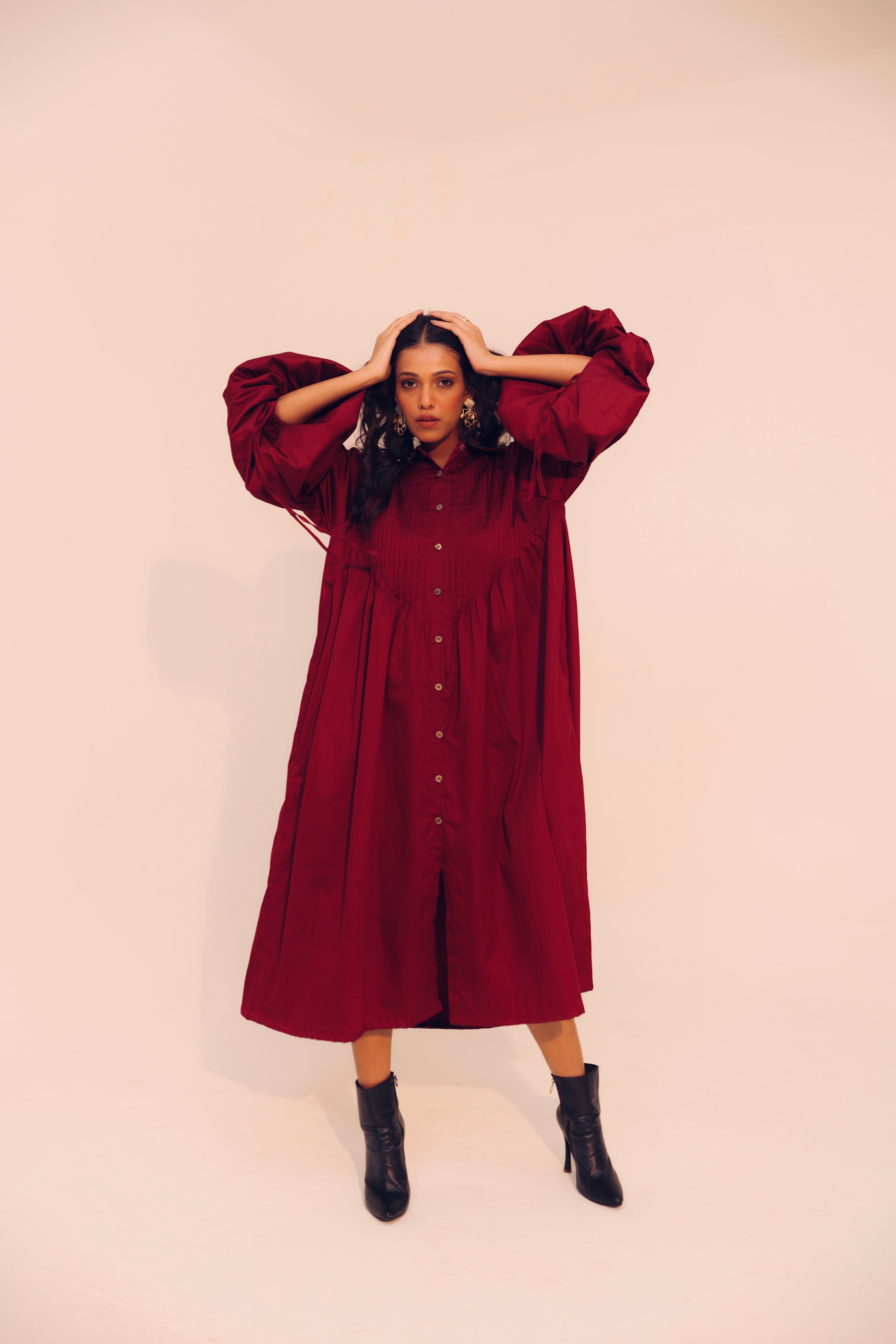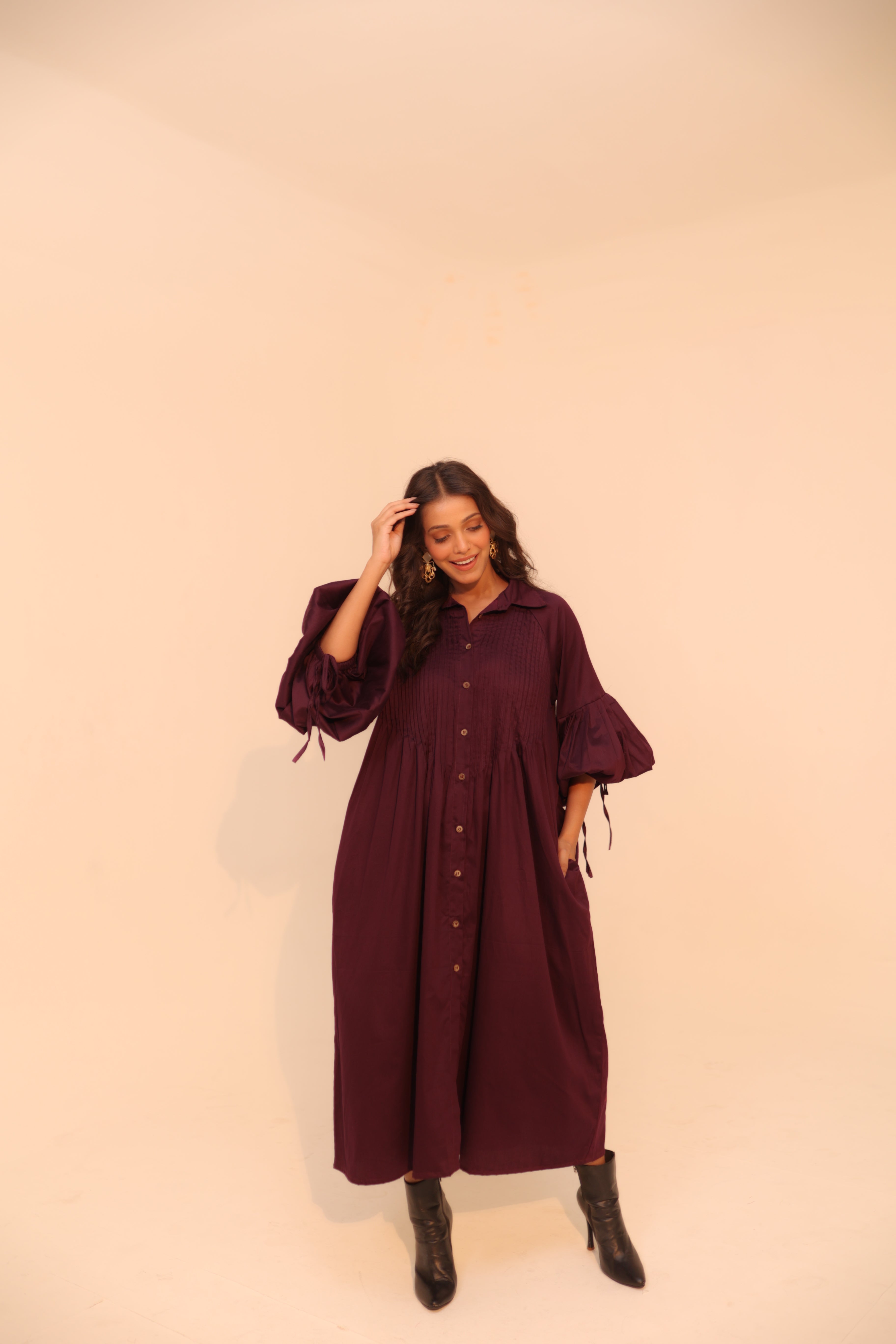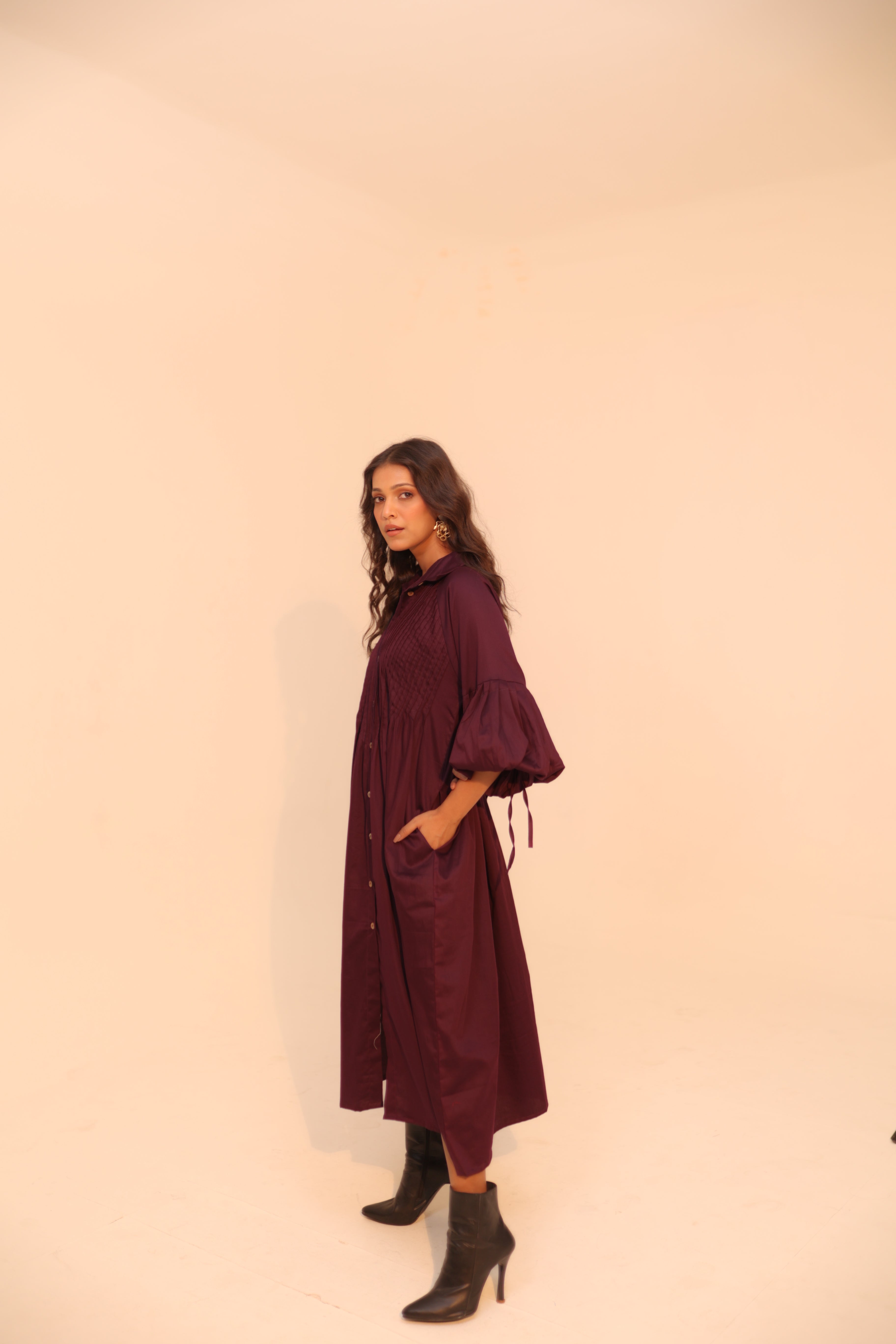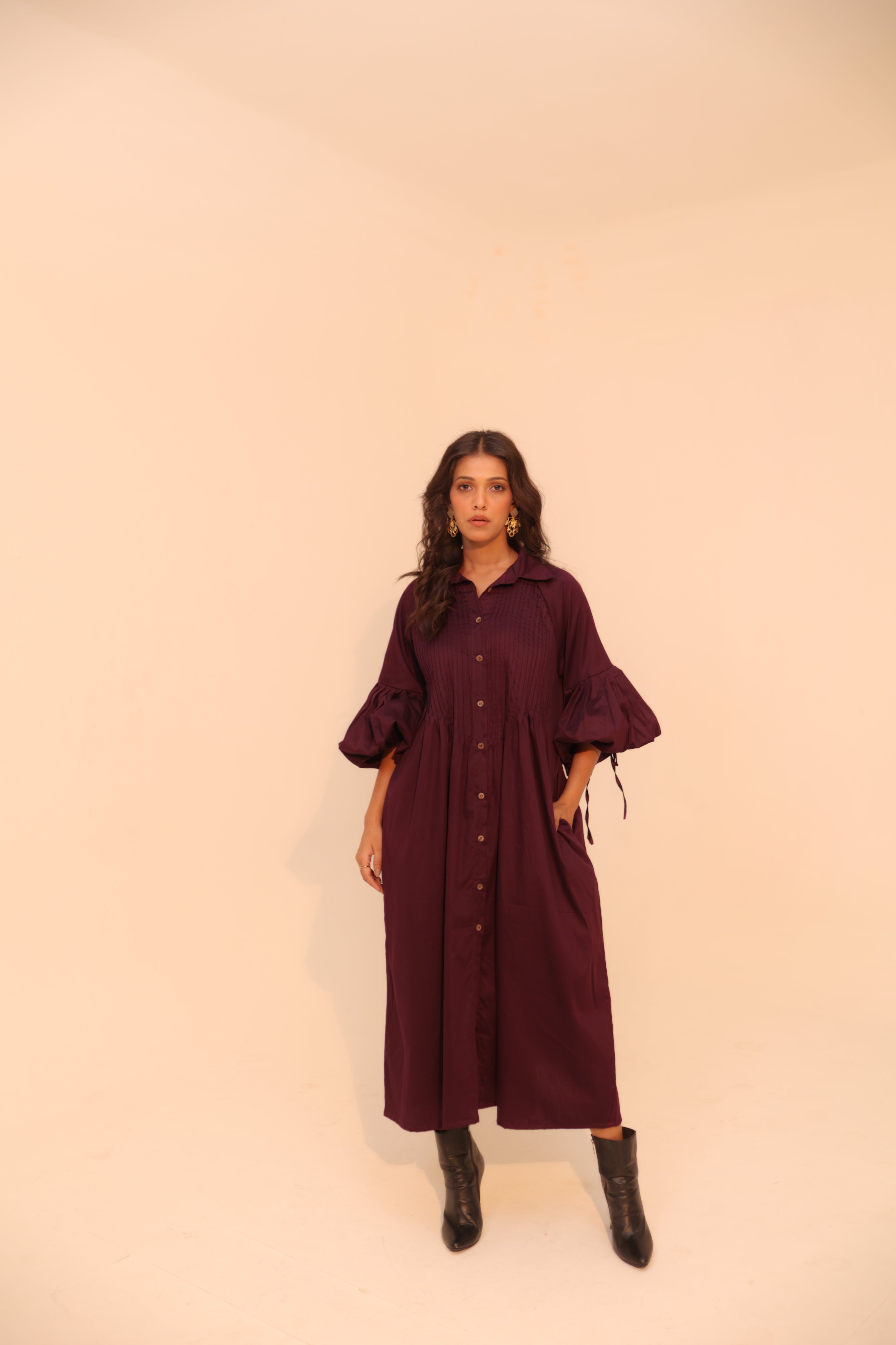Wine Shirt Dress | Soft Cotton | Loose Pattern | Turn Down Collar | with Pockets