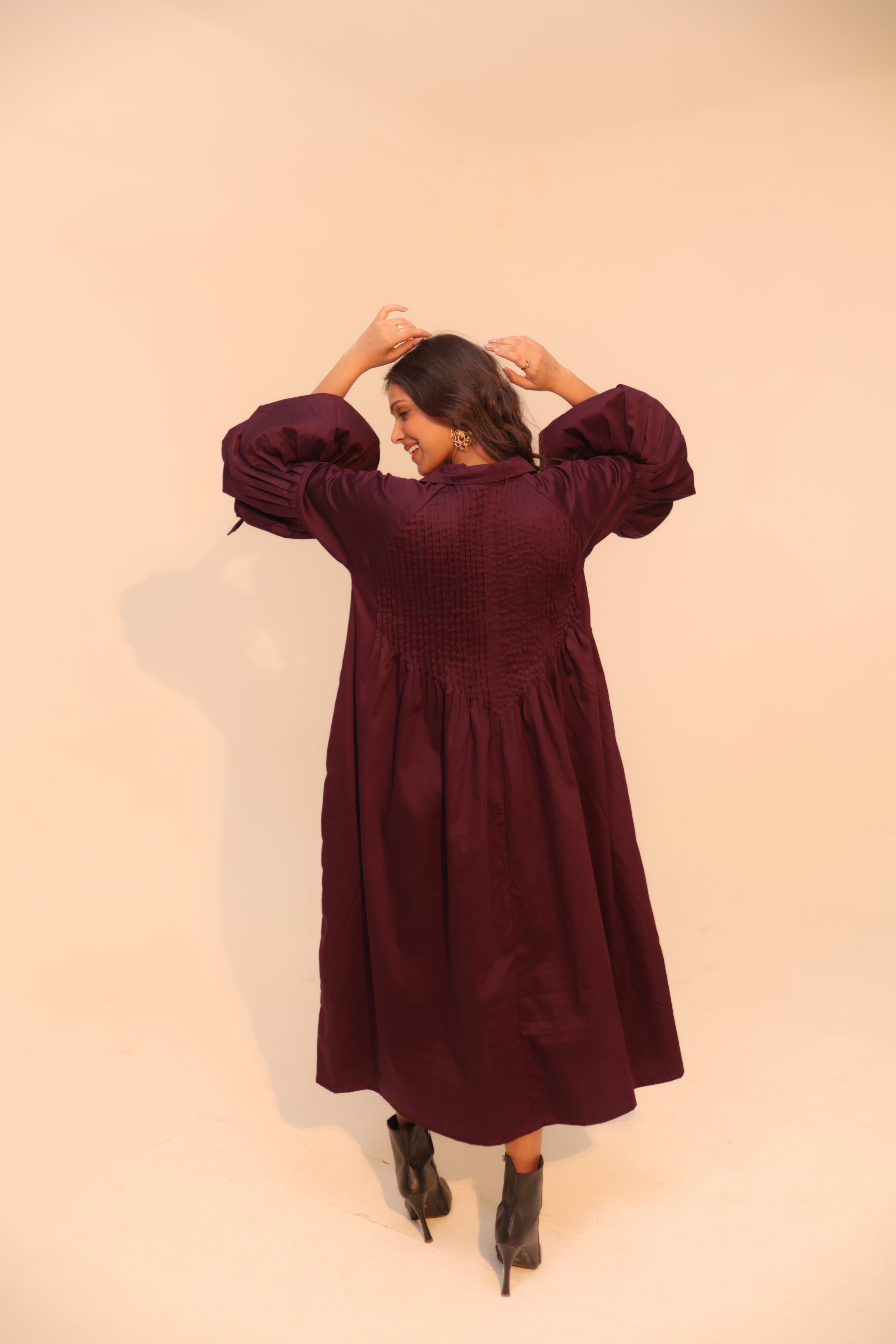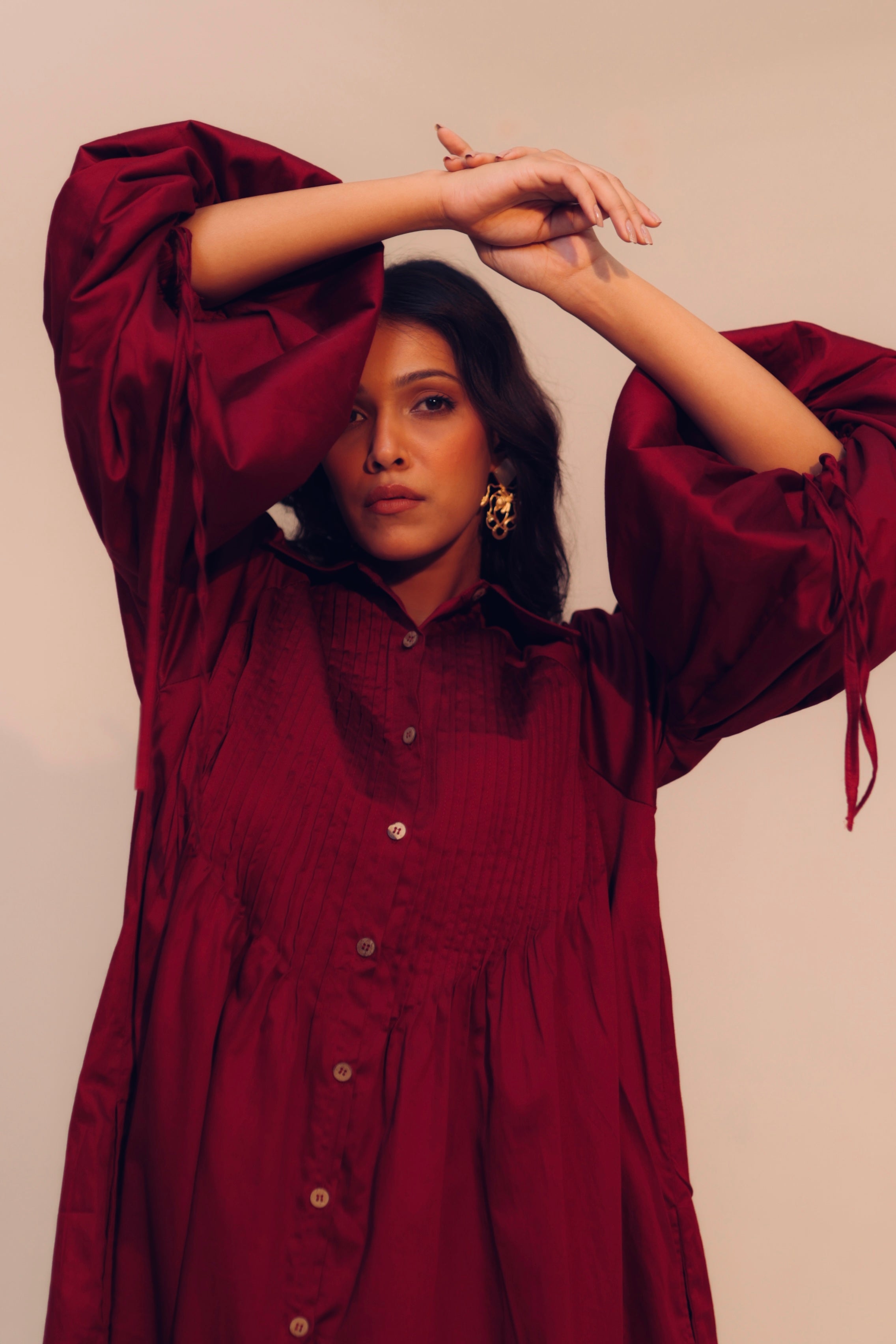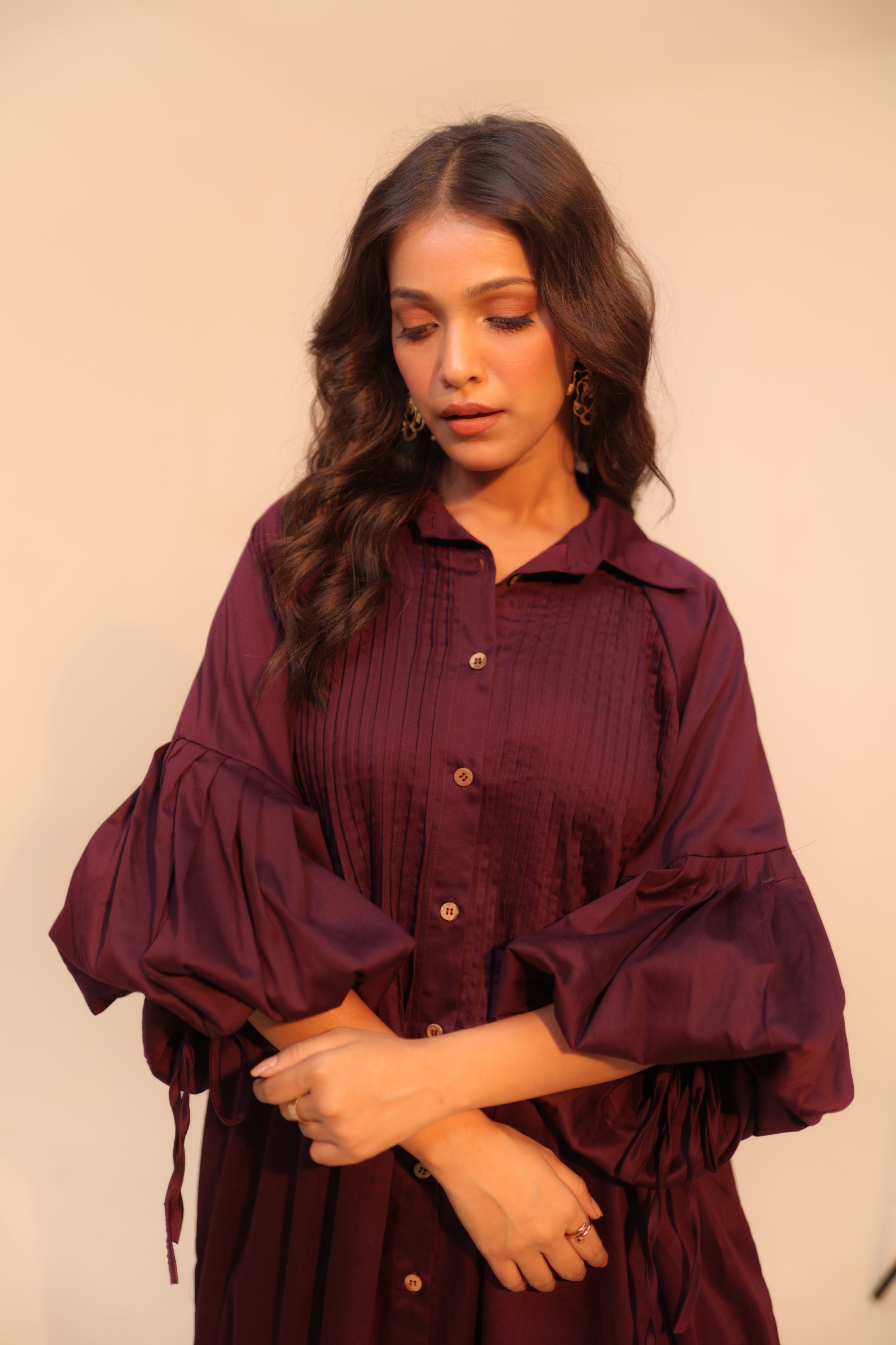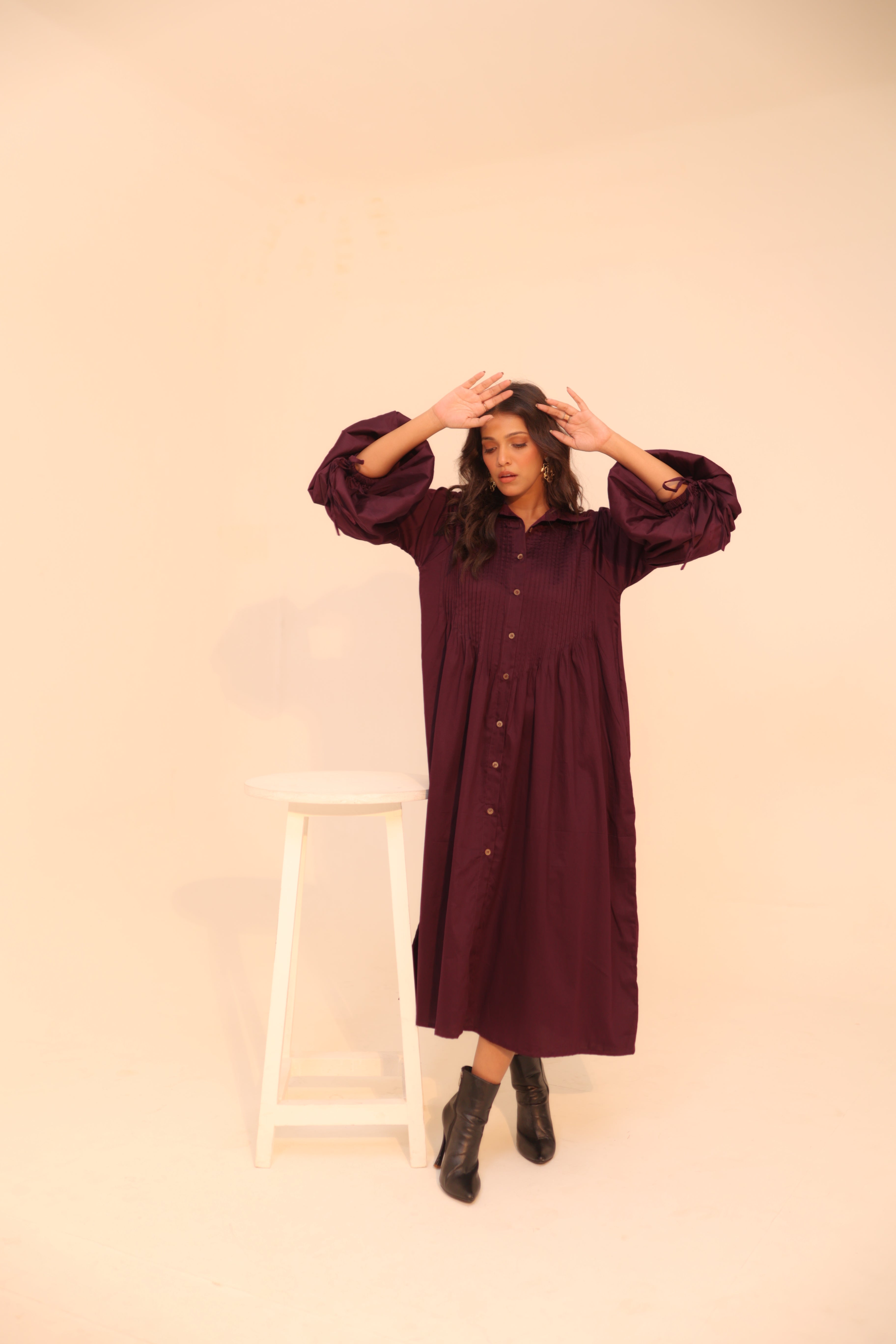 Wine Shirt Dress | Soft Cotton | Loose Pattern | Turn Down Collar | with Pockets