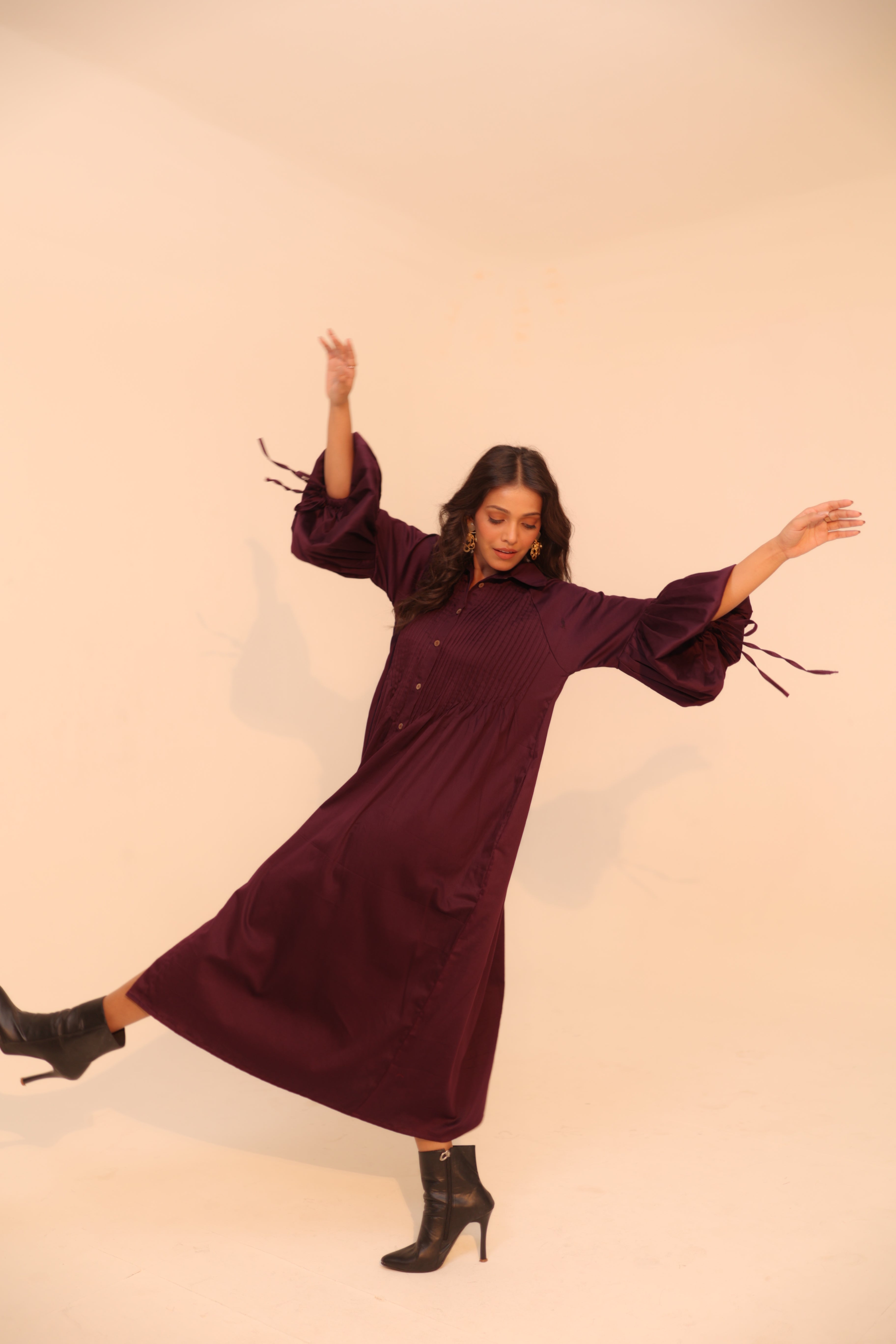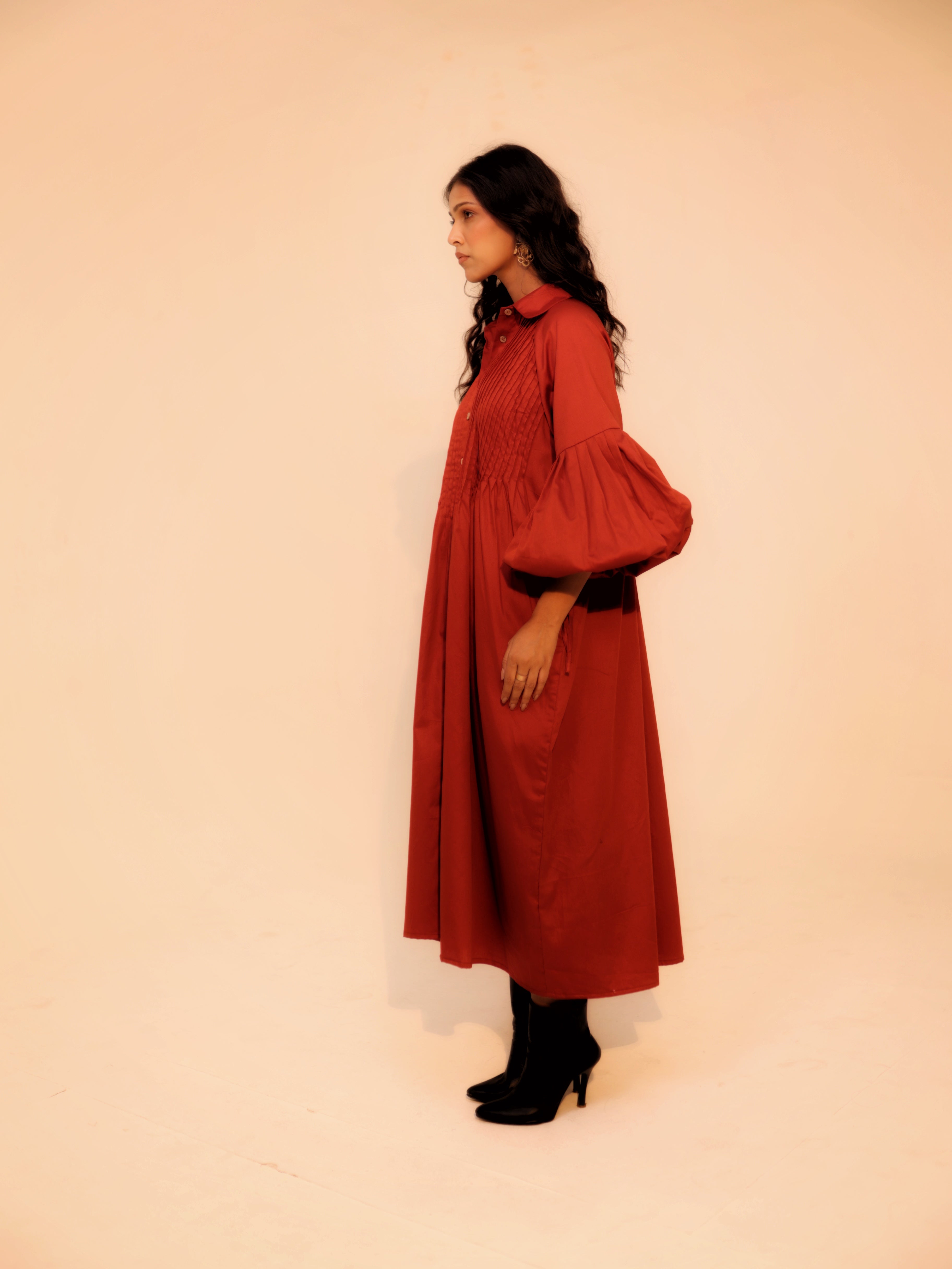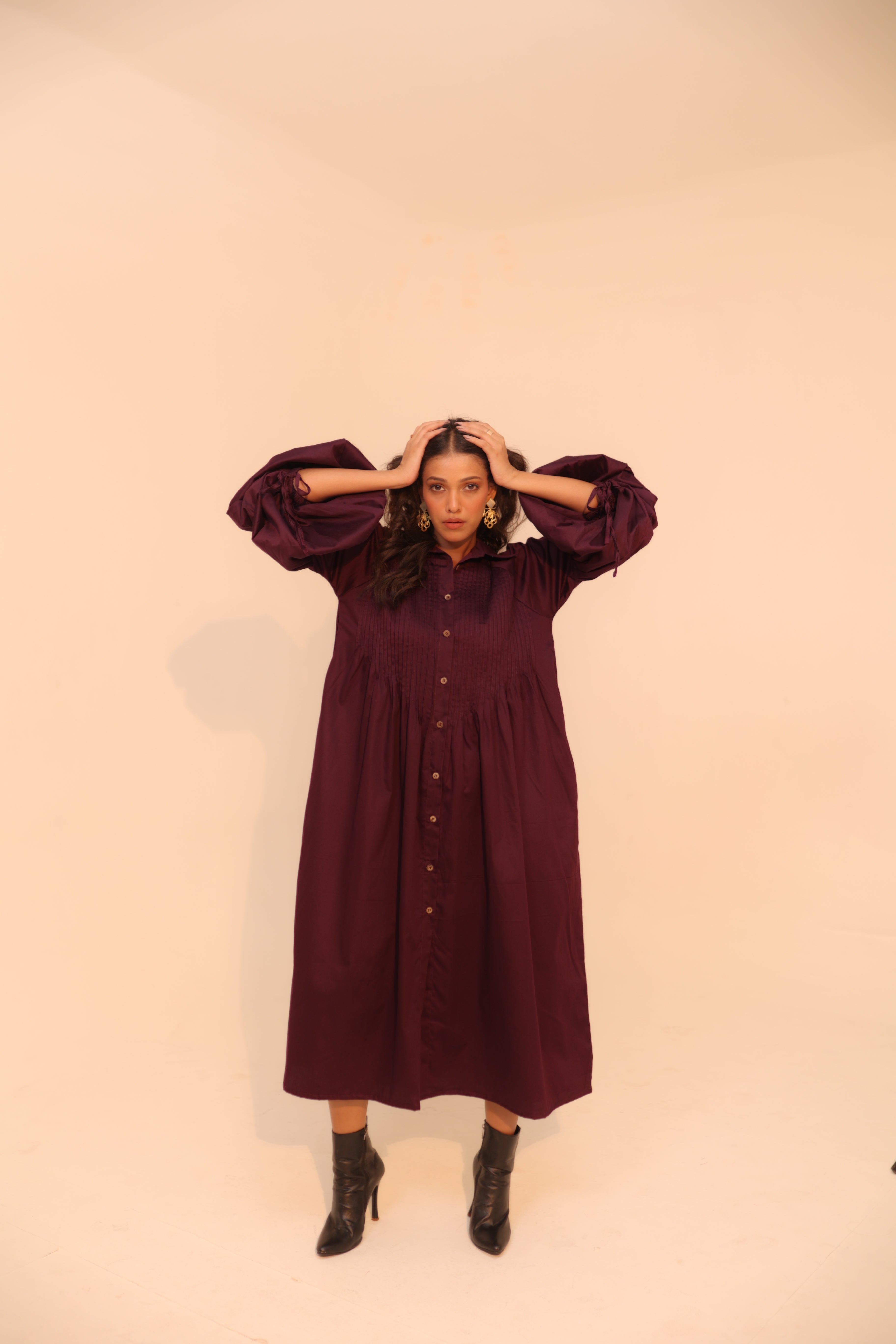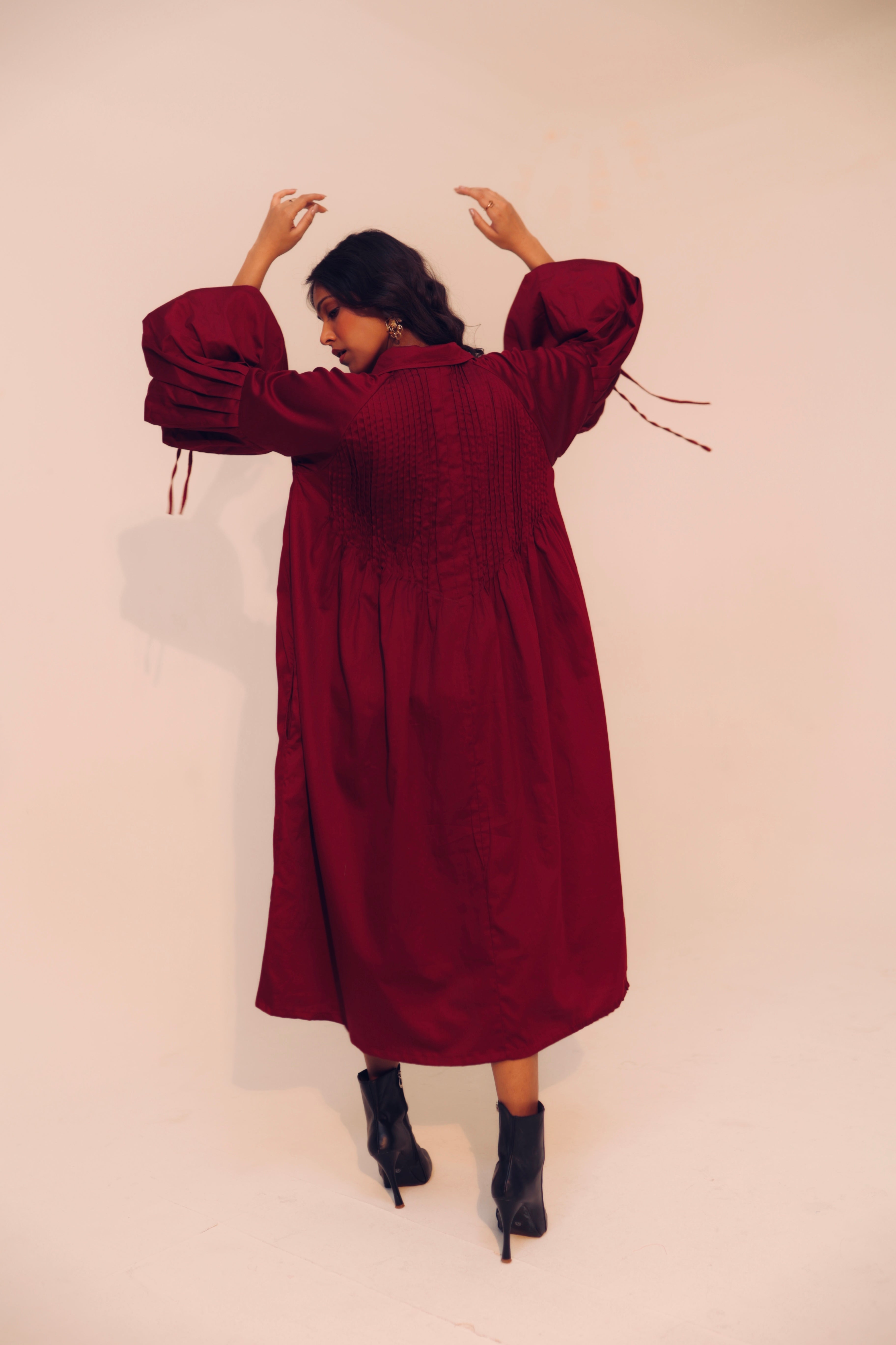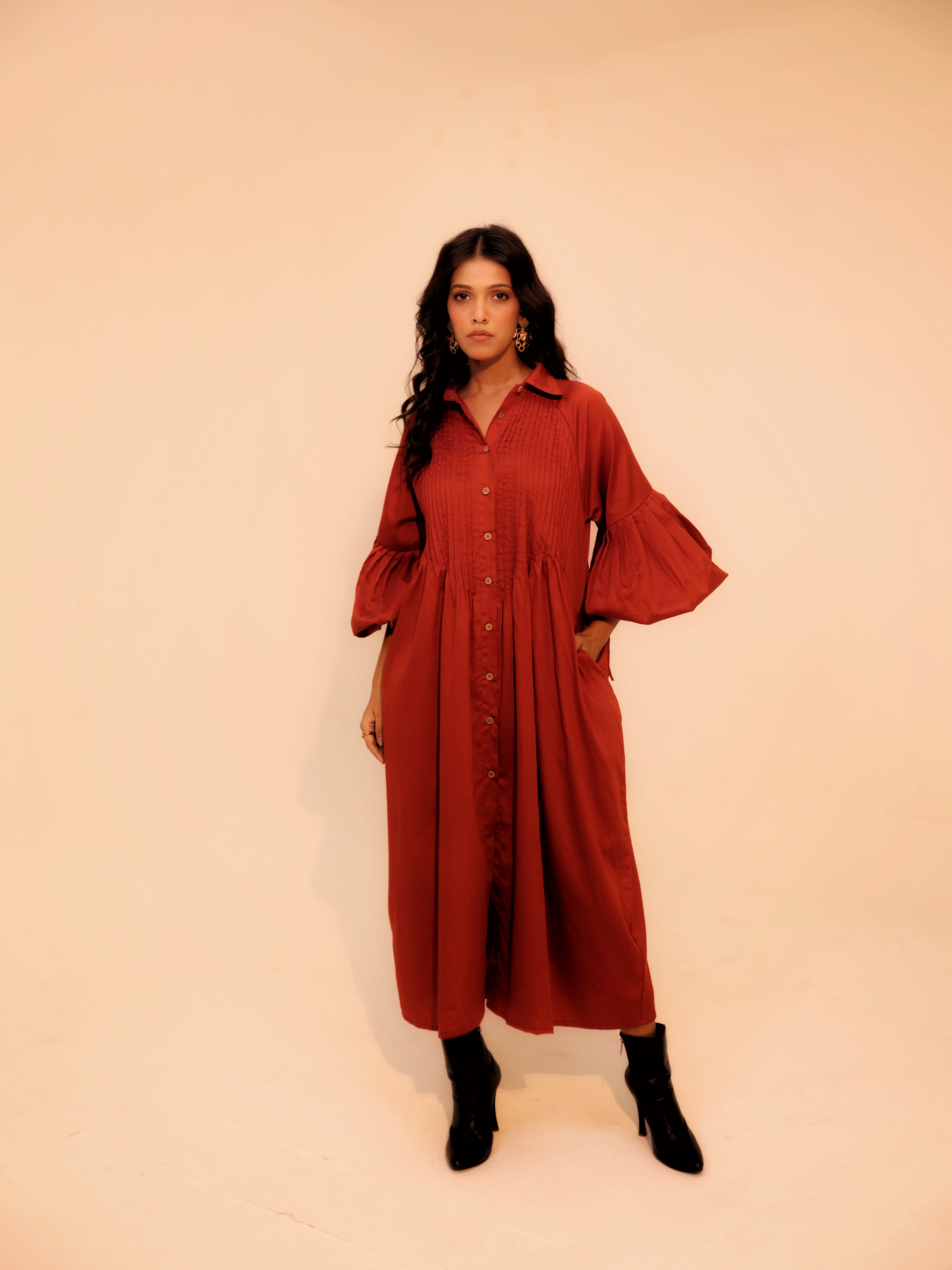 Wine Shirt Dress | Soft Cotton | Loose Pattern | Turn Down Collar | with Pockets