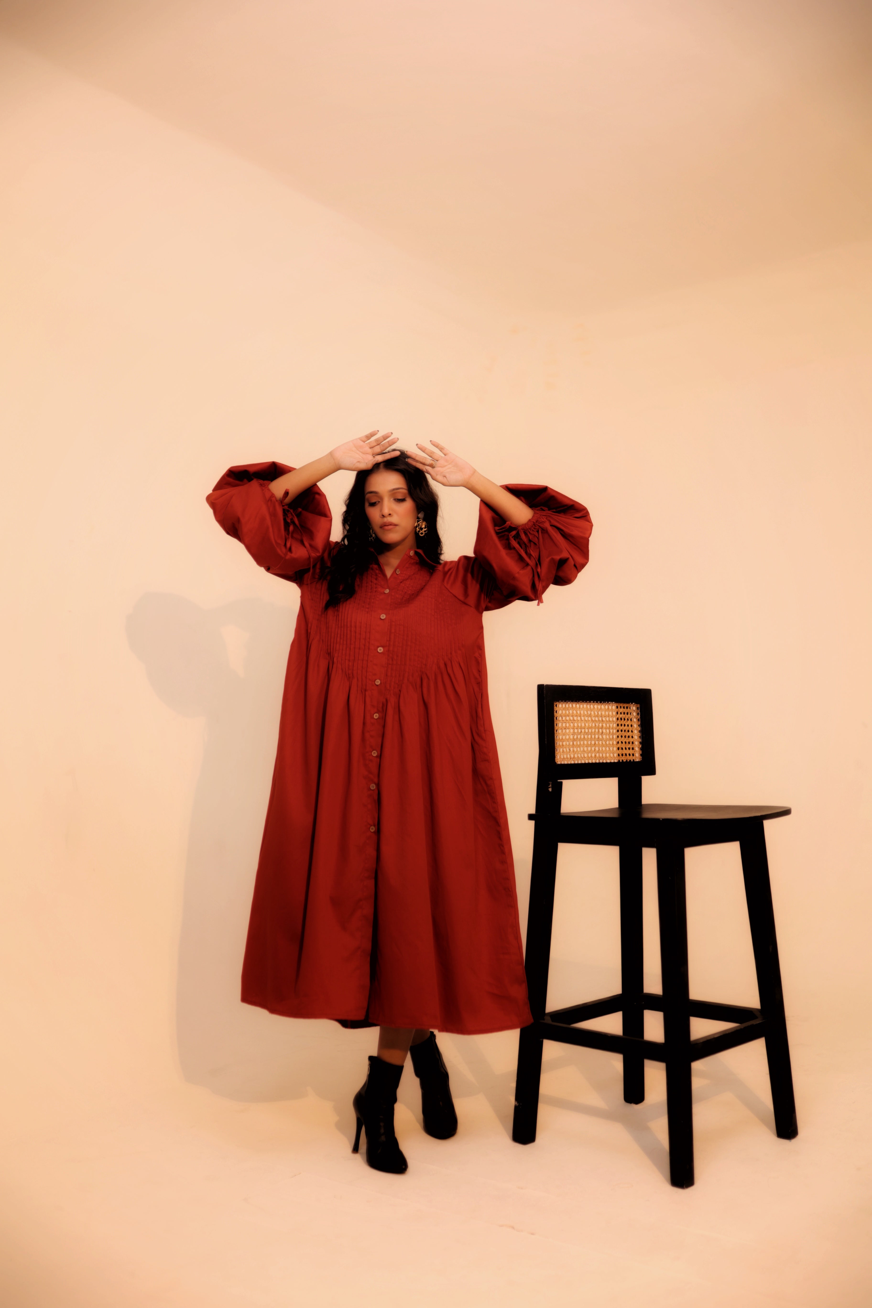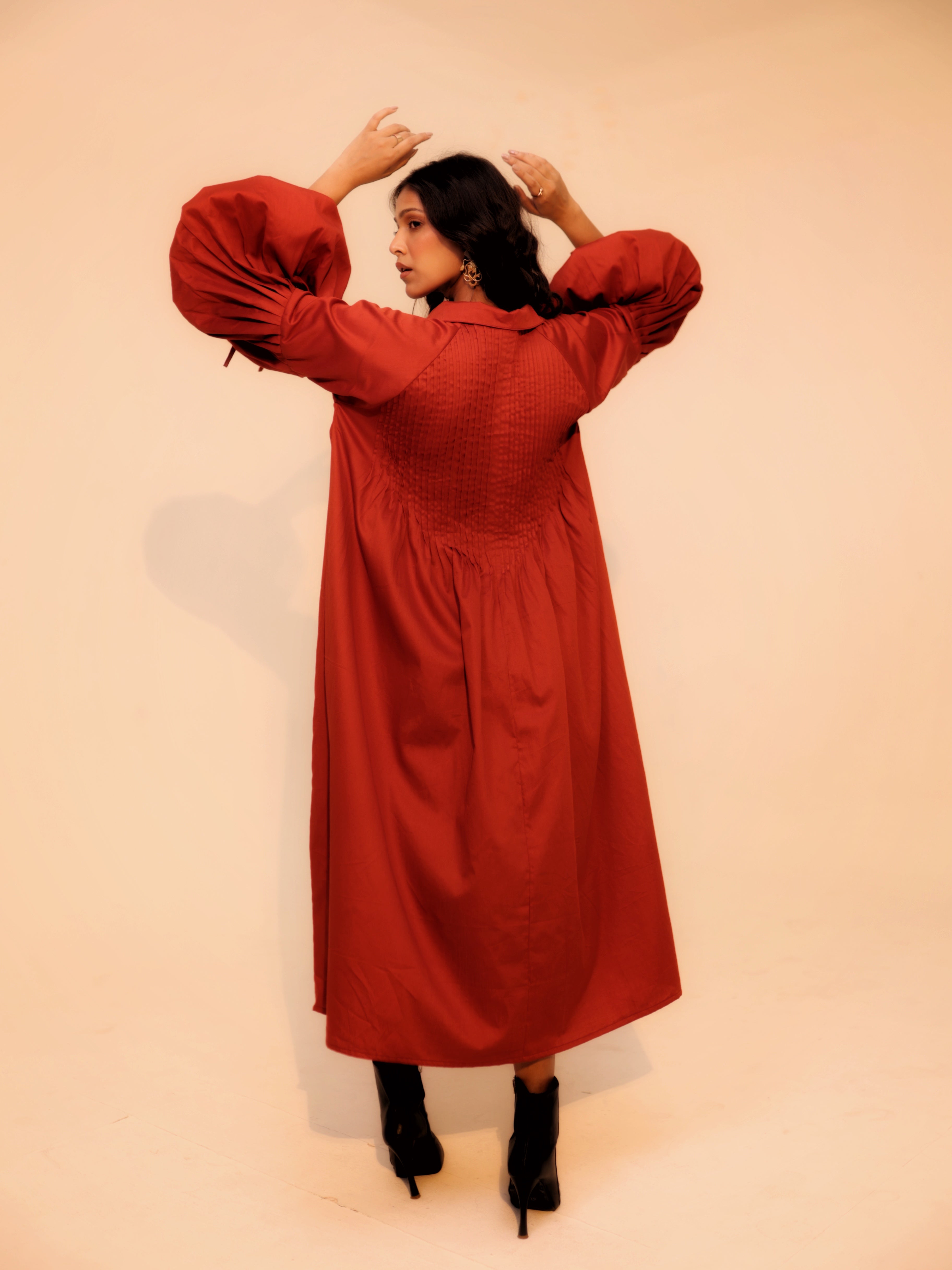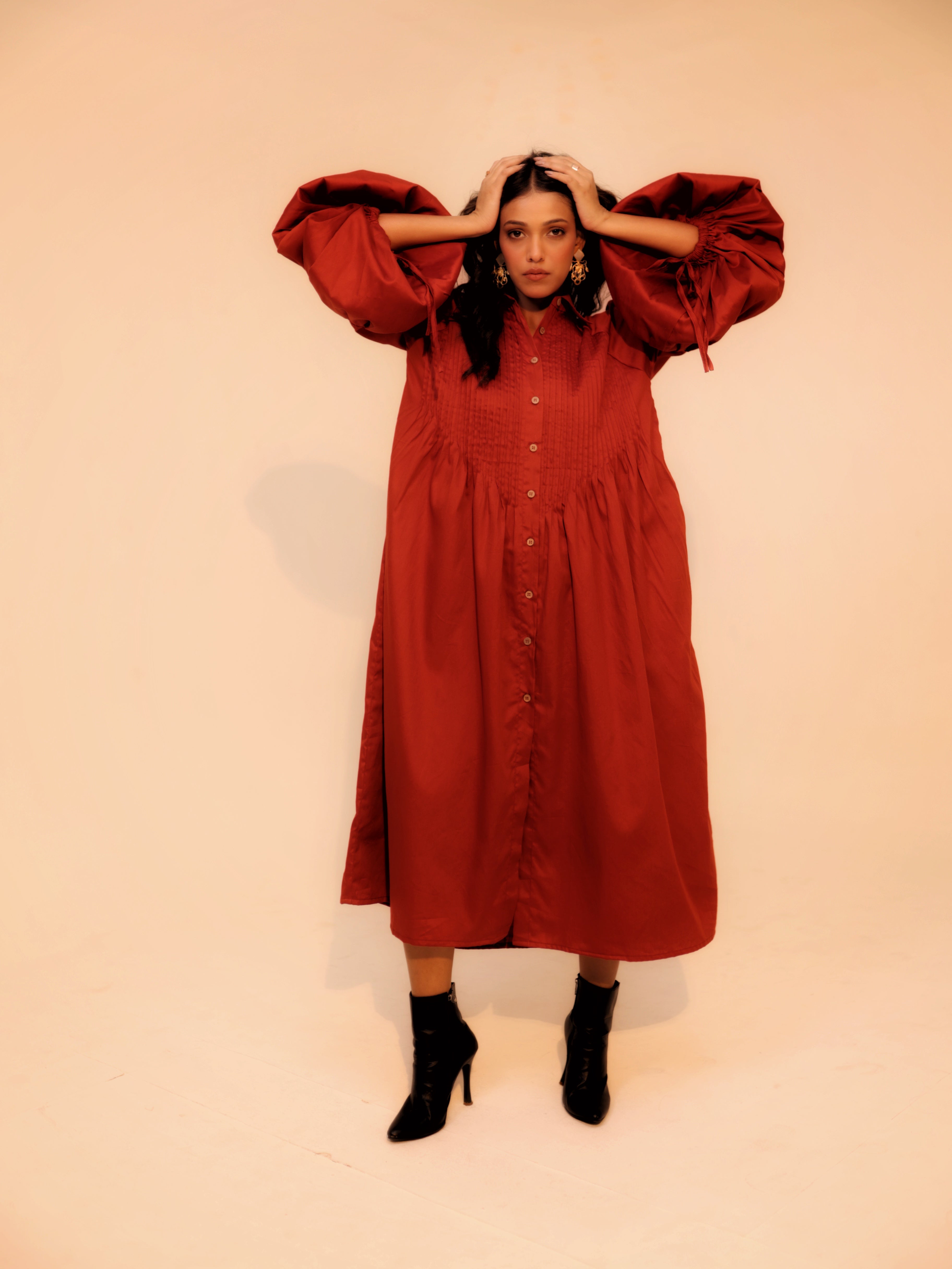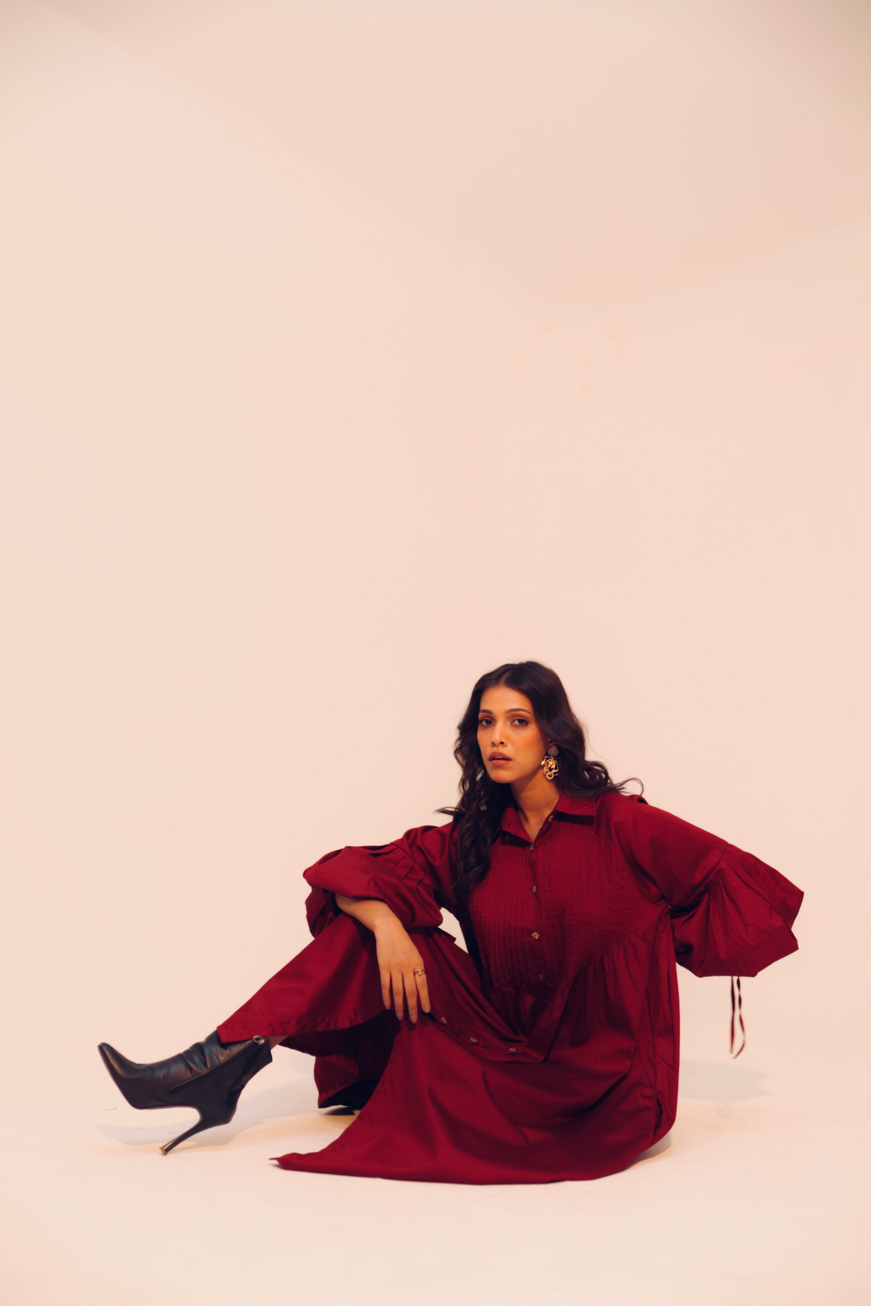 Wine Shirt Dress | Soft Cotton | Loose Pattern | Turn Down Collar | with Pockets