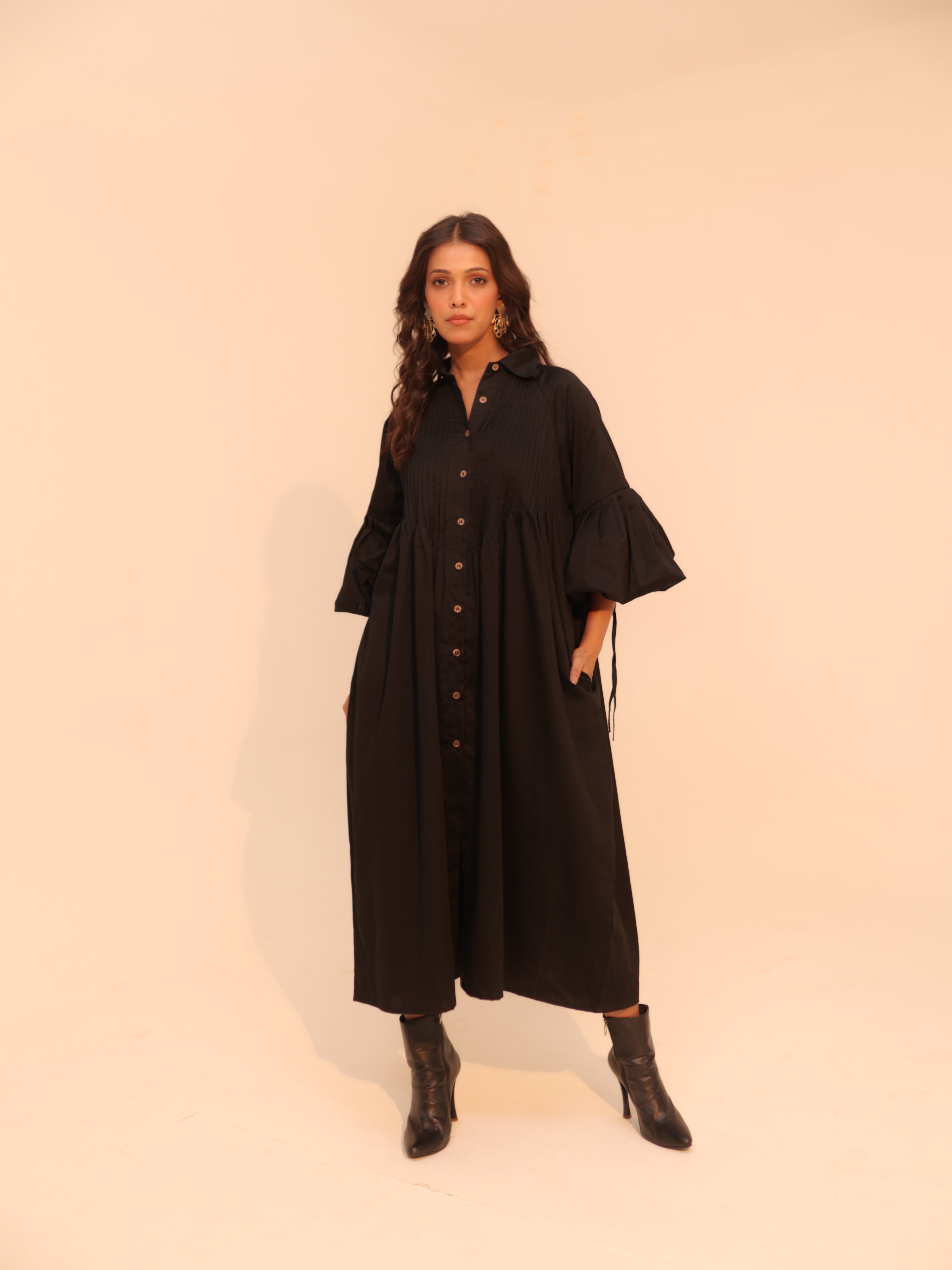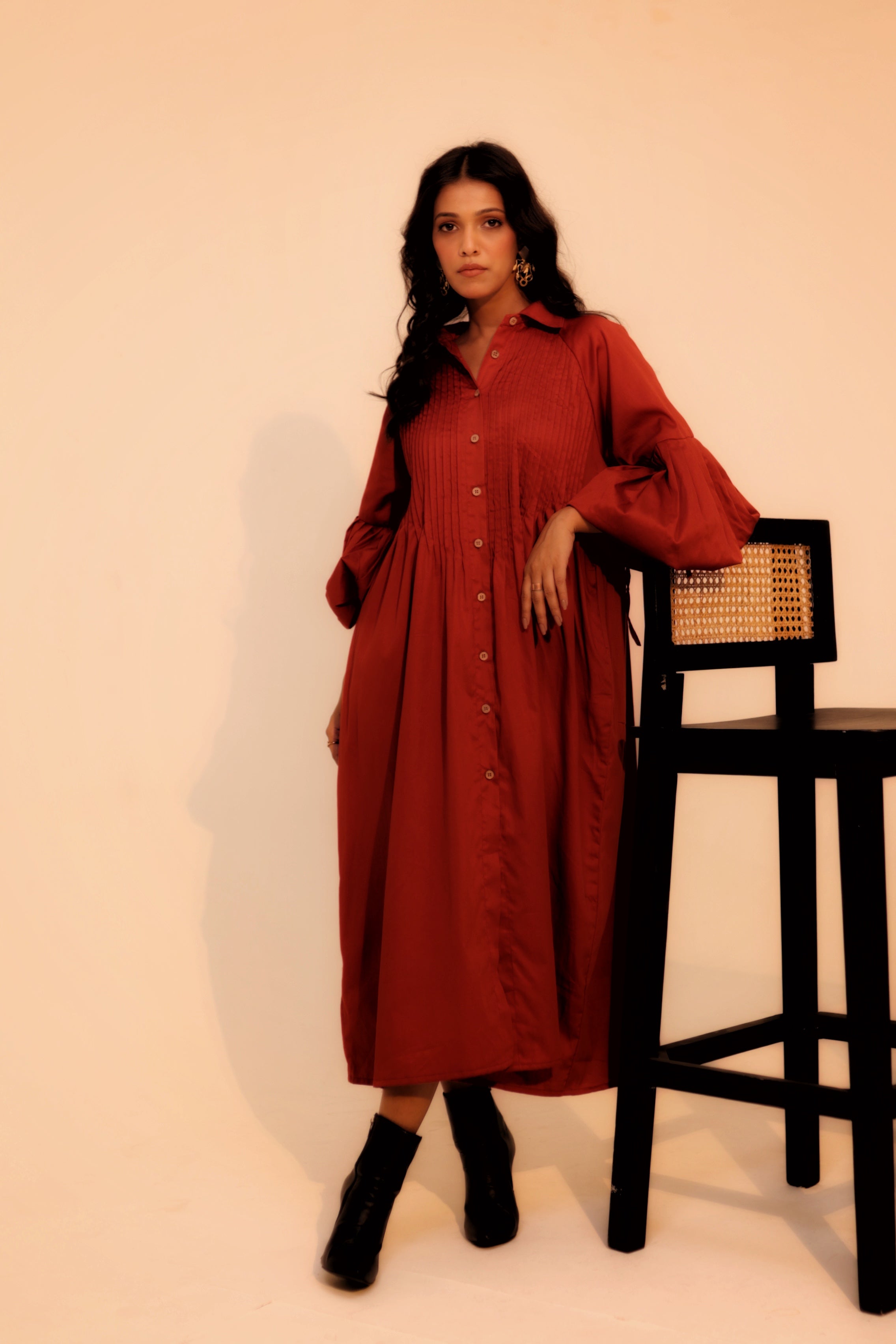 This Wine shirt dress is made from soft cotton, ensuring comfort and breathability. It features a loose pattern and a classic turn-down collar for a relaxed yet stylish look. Designed with practical pockets, it effortlessly combines fashion and functionality.