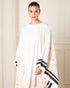 Step into a world of relaxed luxury with our Printed Silk Kaftan Dress. This chic and flowing maxi dress is crafted from a smooth, lightweight silk-like fabric in an elegant cream shade. The design features a delicate, oversized floral print in a beautiful beige and brown tone. The kaftan is framed by bold black and white stripes on the sleeves and hemline, creating a sophisticated and modern look. Perfect for a resort vacation, a beach party, or a stylish brunch, this bohemian-style kaftan offers both comfort and high fashion.